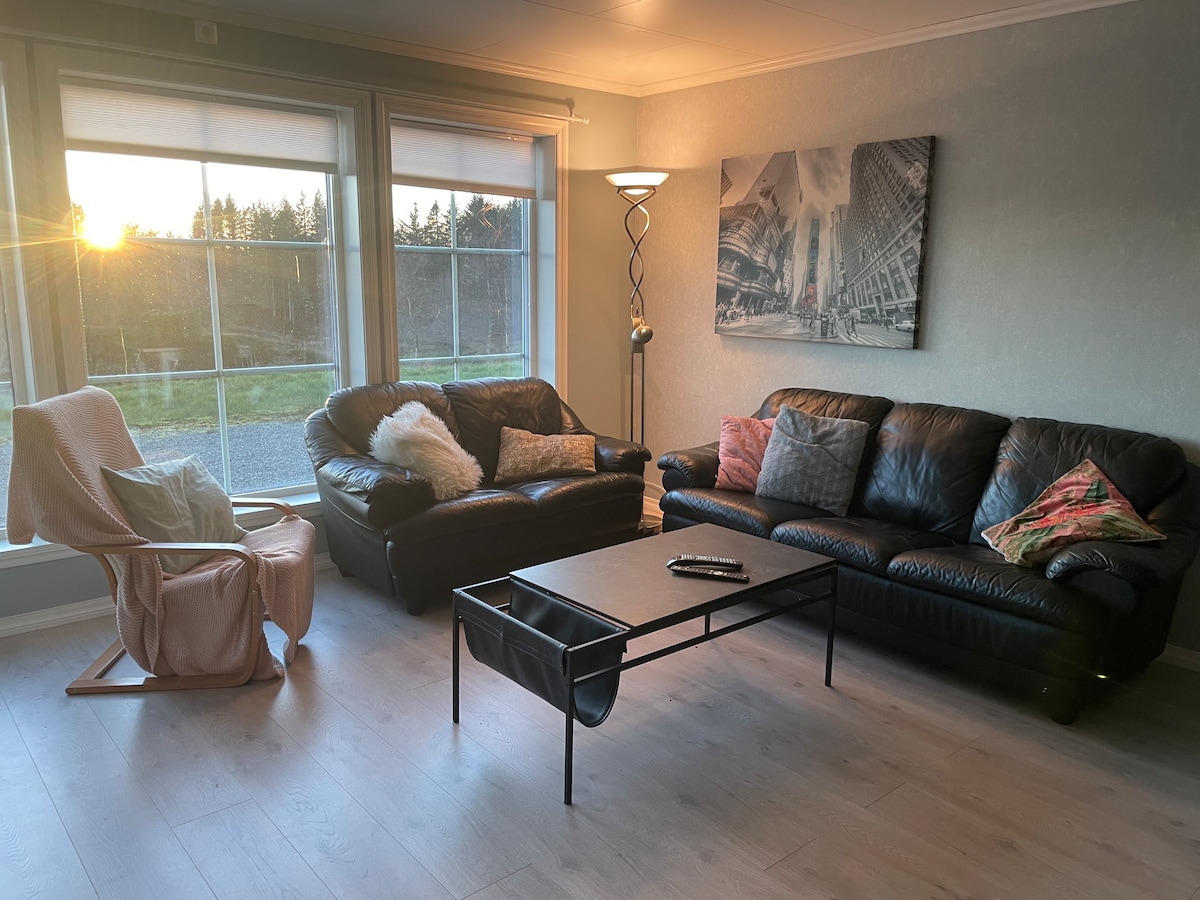 Ein triveleg leilighet i rolege og landlege omgivelsar med utsikt mot fjord og fjell. Romslig stove med open løysing til kjøkken med oppvaskemaskin, kombinert kjøleskap og frys. Dør direkte ut på stor terrasse der du kan nyta morgonkaffien eller andre måltid. Kort veg til butikk og busstopp. Turstiar i skog og mark like utanfor døra. 1 km til sjøen der ein kan bada frå svaberg og stupebrett. Eigen parkeringsplass like ved huset. Med eigen bil er det kort veg til mange attraksjonar i regionen.