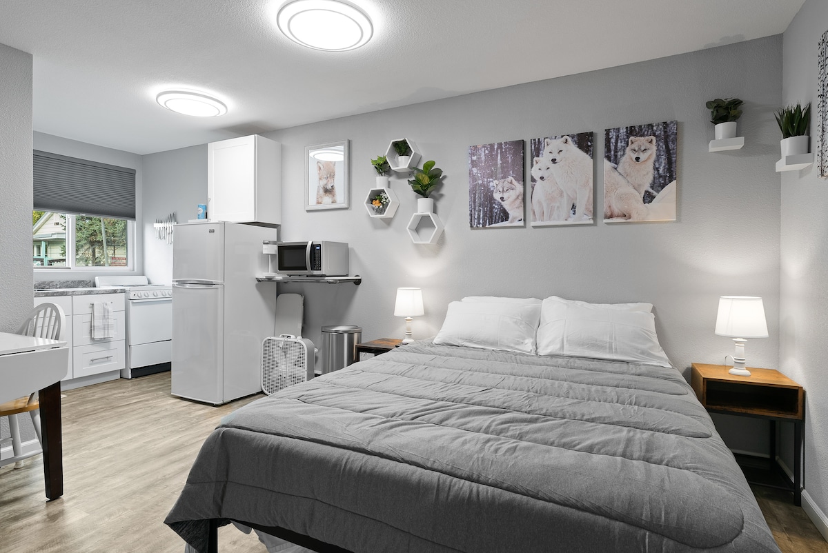 Enjoy the heart of downtown Girdwood! This clean and newly remodeled private apartment offers the ultimate Girdwood experience. Private bathroom, full kitchen, and a large covered porch ensures your stay is comfortable and relaxing. A luxurious pillow topped new king size bed awaits you. A futon is also available for the kids or your mother-in-law. The location can't be beat! Less than a 2 minute walk to restaurants, coffee, mercantile, clinic, post-office, and a free shuttle.