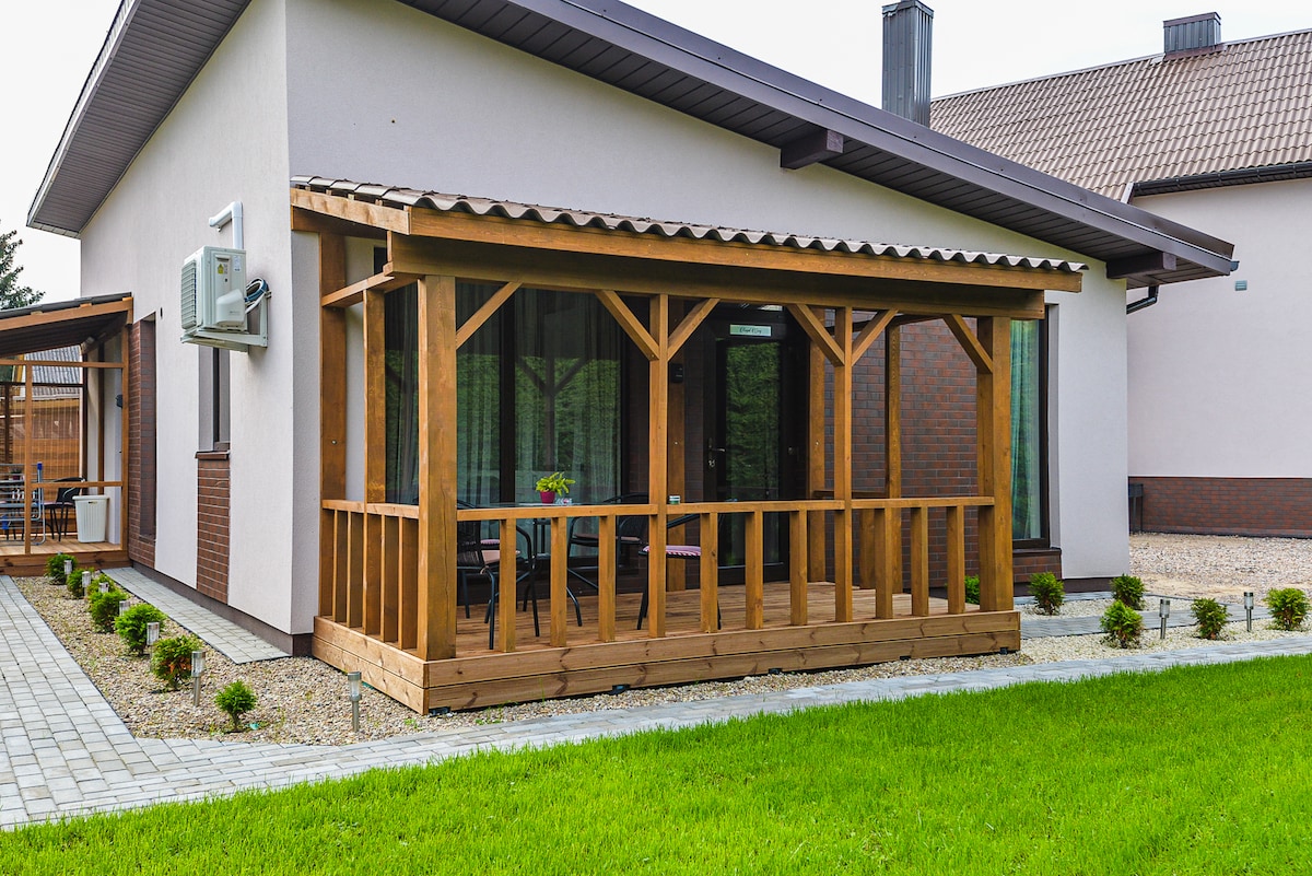 The cottage has a masculine style. Shades of dark green in the living room go perfectly with leather chairs. The kitchen is black with bronze, metal fixtures, and above the bed, there is a mosaic of urban-themed paintings along with a vintage green sofa. In the bathroom, there is a gray concrete color with black and green accents, and of course, paintings - they always add coziness and a sense of feeling. This cottage is a perfect masculine space where anyone, including women, can feel great.
