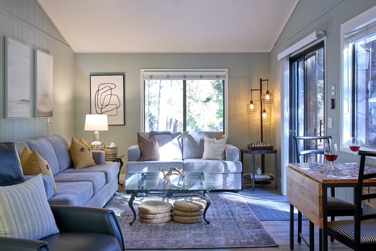 Rare lake views, mid-century A-frame charm, and a dog at your feet — this is the cabin reset you've been looking for. Water quiets the mind. This is one of the few cabins in Lake Mont Pines where you'll actually feel it. Wake up to coffee, step out to a private deck, and stroll downhill to the water. Ski Bear Valley, wander Big Trees, sip wine in Murphys. Groceries close. Adventure and stillness, perfectly balanced.