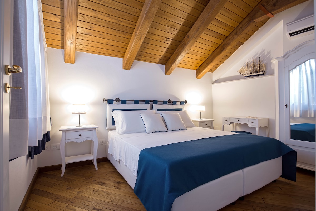 Aida is a boutique apartment on the top floor of Le Capannelle, a charming property that blends in with the surrounding nature and with panoramic views on the Mediterranean Sea. The interiors feature a sleek and contemporary décor, with a minimalist twist and attention to individual comforts. The living space with a sofa bed double is characterized by discreet blue details and a teal niche. The nuances run as a common design thread throughout the apartment, surfacing in the furniture of the bedr
