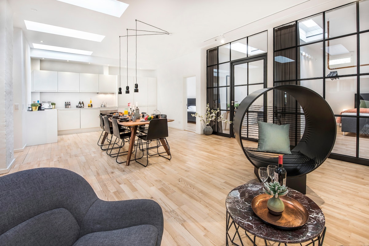 Unique and magnificent private apartment in an unbeatable location at the heart of Inner Copenhagens middle age area. Your own “town house” with a private entrance from a quit sidestreet. A high-end luxury spread over 140 sqm, you stay in a fusion Art Gallery luxury apartment Design furniture, hand built kitchen, wooden floors. high ceilings, contemp. art. Historic estate built in 1789 once a theater This place is also perfect for business meetings / work stays of longer or shorter periods