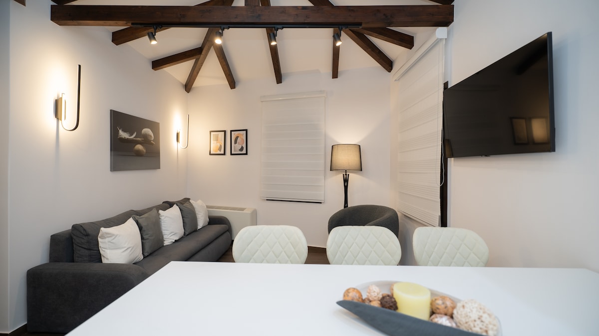 The Grand View Villa is a newly refurbished, but classic, Greek home. From the exposed beams to the classic kitchen, the decor and to the fire place, the home brings a warm, old world feel to a perfect intersection with today's comforts and luxuries. The Master Bedroom hosts it's own private bathroom, where the Guest Room provides two beds for our variety of guests. Two open air balconies side the house, and the living room presents you with a fireplace that can be used at any time.