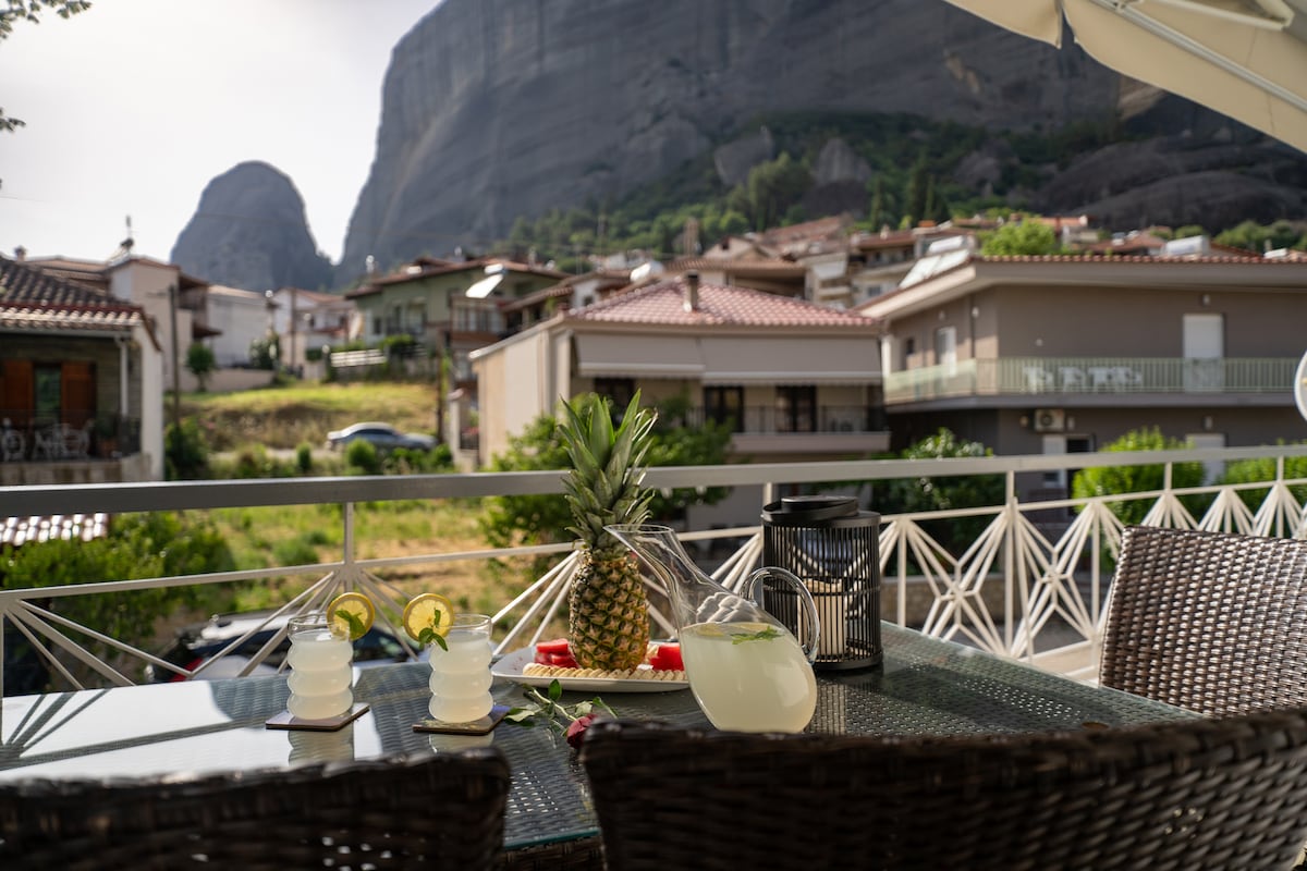 This stylish and sunny apartment of 100m2 is situated in the Old town of Kalampaka. It is located in a beautiful scenery surrounded by trees with a breathtaking terrace view of the famous Rocks of Meteora!By staying here you have great access to Kalampaka's shopping area (restaurants, bakery shops,coffee shops, banks, post office etc.) as it is only 5 minutes away from the town's center. It is in a quiet neighbourhood convenient for reaching out the best spots of Kalampaka even exploring Meteora on foot! The key position, the professional cleaning and the elegant decoration makes it suitable for every guest.
