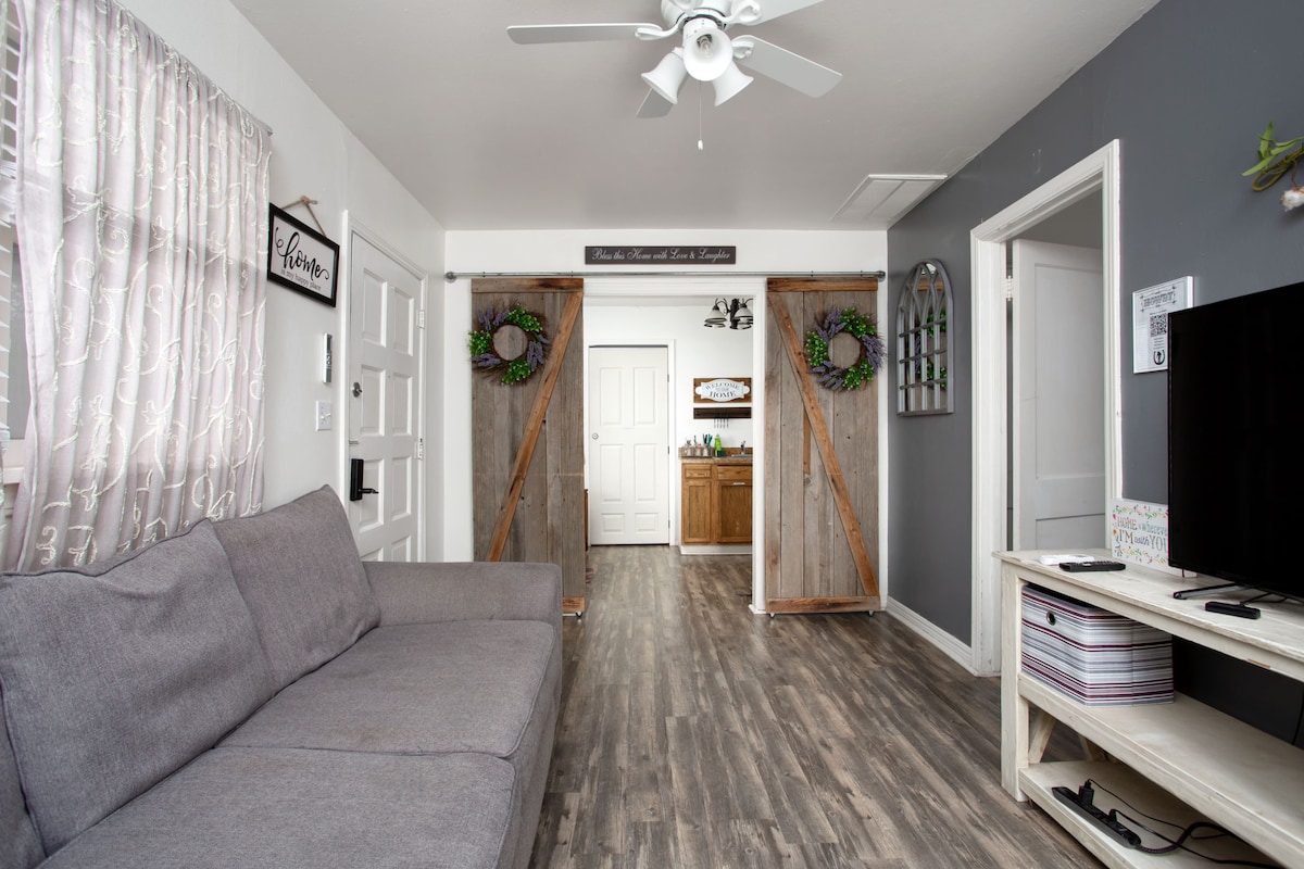 Beautiful, quiet, private & serene barn apartment (built in 2021) with country views of the Texas sunrise & sunset from the patio. Secure & Safe!! Located away from all the hotels! Farmhouse look/feel. Great WiFi, abundant driveway parking (oversized parking available) and a wraparound corner patio. Close to I-40 (3 miles), yet far enough away that it doesn't feel like you are in the middle of nowhere. Less than 10 minutes from Amarillo where all the amenities of “city life” are available.