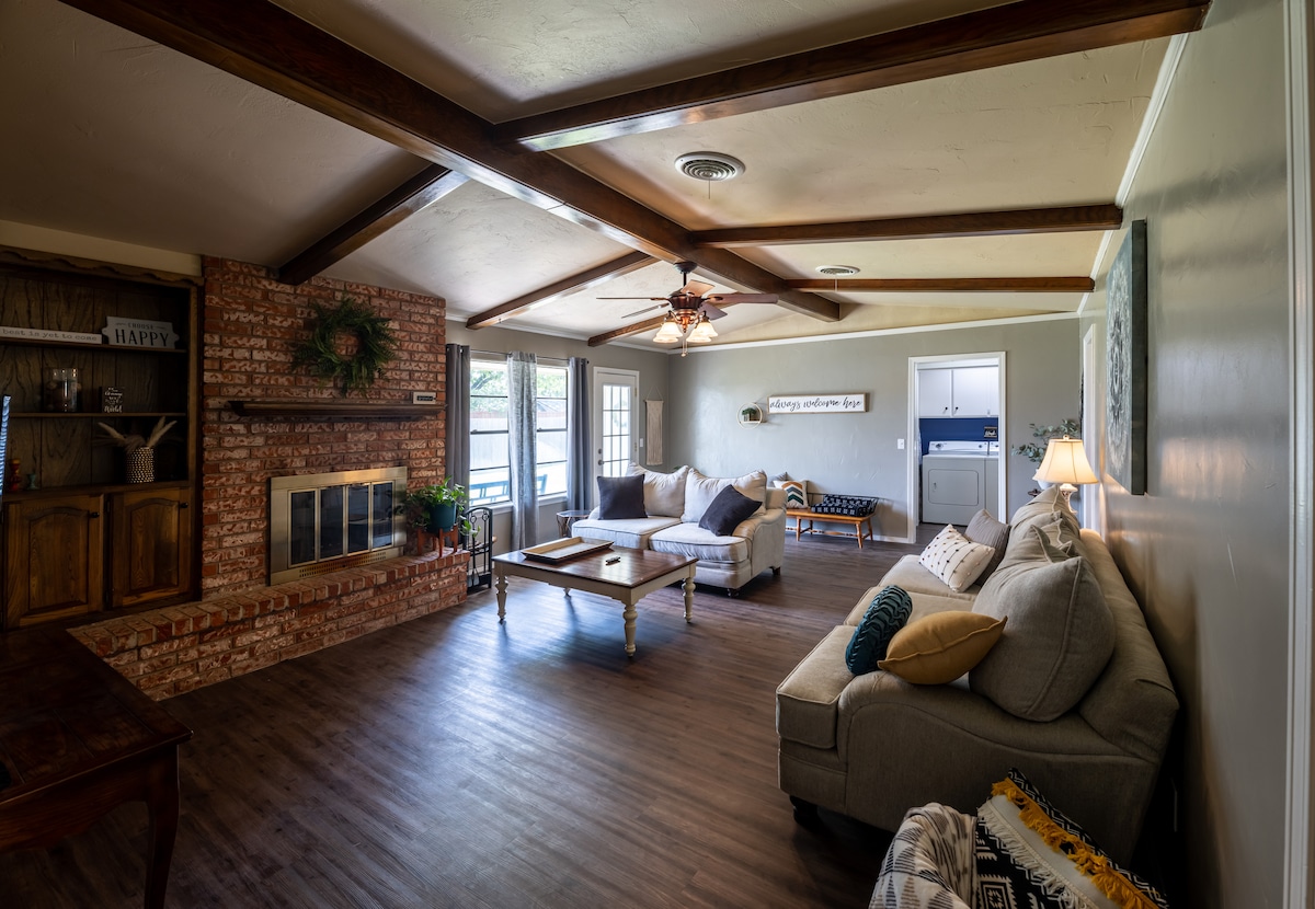 带加大双人床、壁炉、洗衣机和烘干机的舒适3卧室房源