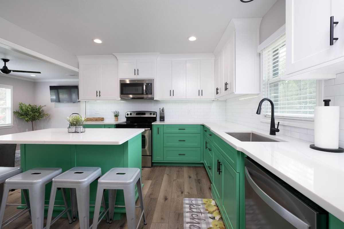 Keep it simple at this peaceful and centrally-located place with a fun botanical theme. The house has a HUGE, fully-fenced, private backyard with amenities for children to play (including a play house and a treehouse). There is plenty of room for pets to run, families to play horseshoes, tether ball, and croquet. Each bedroom has a smart TV and a queen bed with a Purple brand mattress.