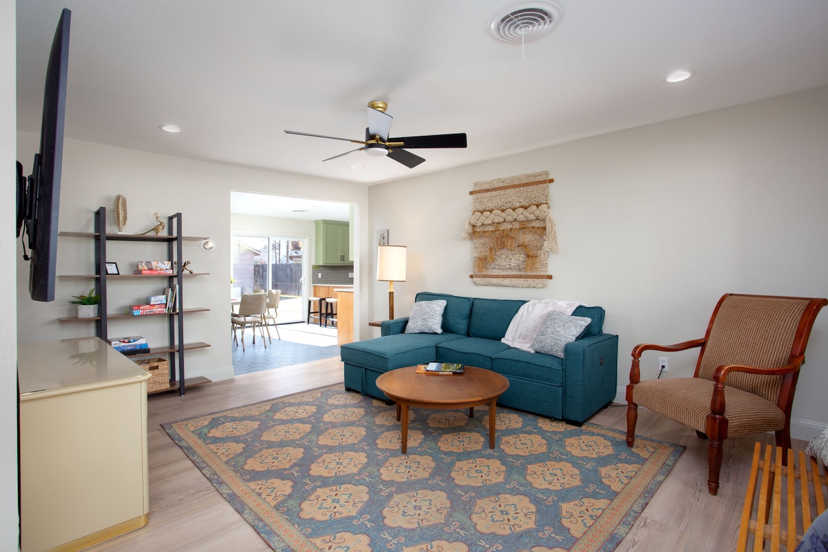 Keep it simple at this peaceful and centrally-located place with a fun botanical theme. The house has a HUGE, fully-fenced, private backyard with amenities for children to play (including a play house and a treehouse). There is plenty of room for pets to run, families to play horseshoes, tether ball, and croquet. Each bedroom has a smart TV and a queen bed with a Purple brand mattress.