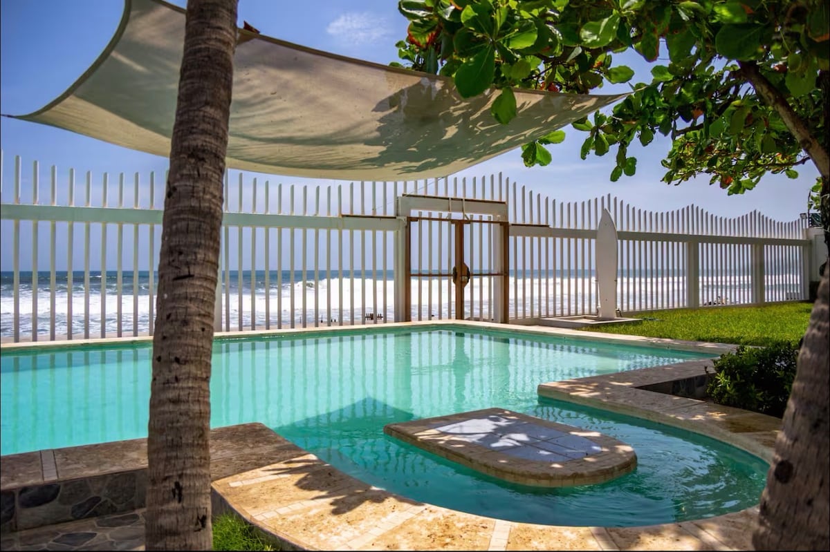 Wake up to the sound of the waves in this private beachfront home in Costa del Sol. With three pools, ocean views, and open spaces made for relaxation, every corner invites you to unwind and enjoy. The home features A/C in all rooms, fast Wi-Fi, a large garden with a hammock and BBQ area, and a fully equipped kitchen with a coffee station, wine fridge, and purified water. Perfect for families or friends who love sunsets and long beach walks, surrounded by vibrant tropical nature.