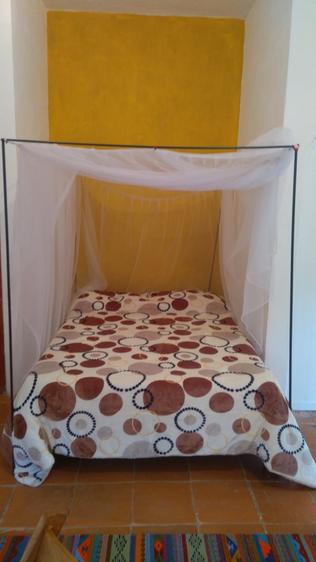 Cuarto independiente con baño privado. Al frente una terraza con vista al valle desde donde se puede contemplar el atardecer entre las montañas. Debido al clima del lugar la terraza es muy agradable para comer al exterior. A la pequeña cocina se accede desde allí. Existe un Eco filtro con agua dentro del cuarto/ se le agrega agua del grifo de la cocina.