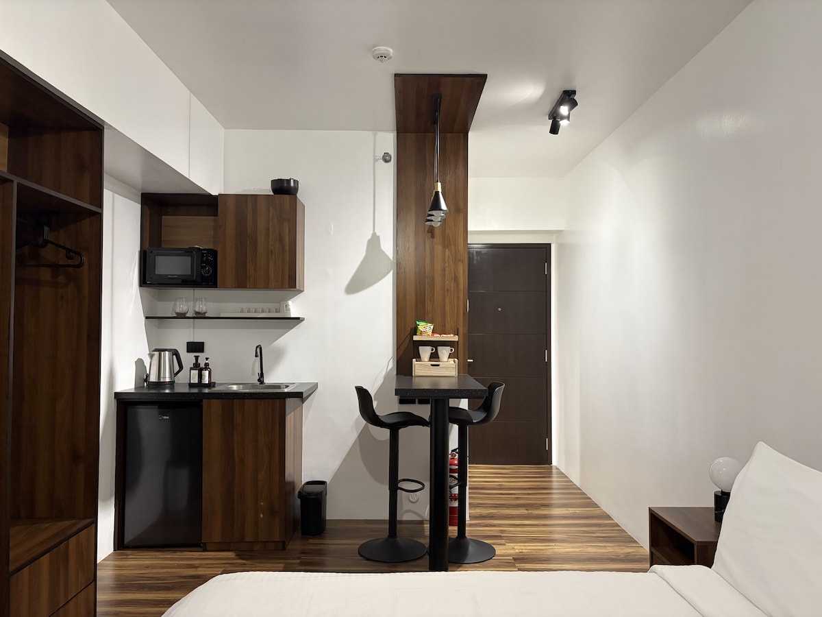 A studio unit with a king size bed, classy and minimalist design perfect for its spacious working area for those who work remotely but want to experience city life. A 2 seater sofa that conveys comfort while watching your favorite netflix. The kitchen has complete basic cooking needs and utensils. The bathroom has a water heater and basic dental and essential hygiene. Thoughtfully added hair dryer and extension wire It is facing Corrales st. so you can enjoy acoustic music until 12mn.