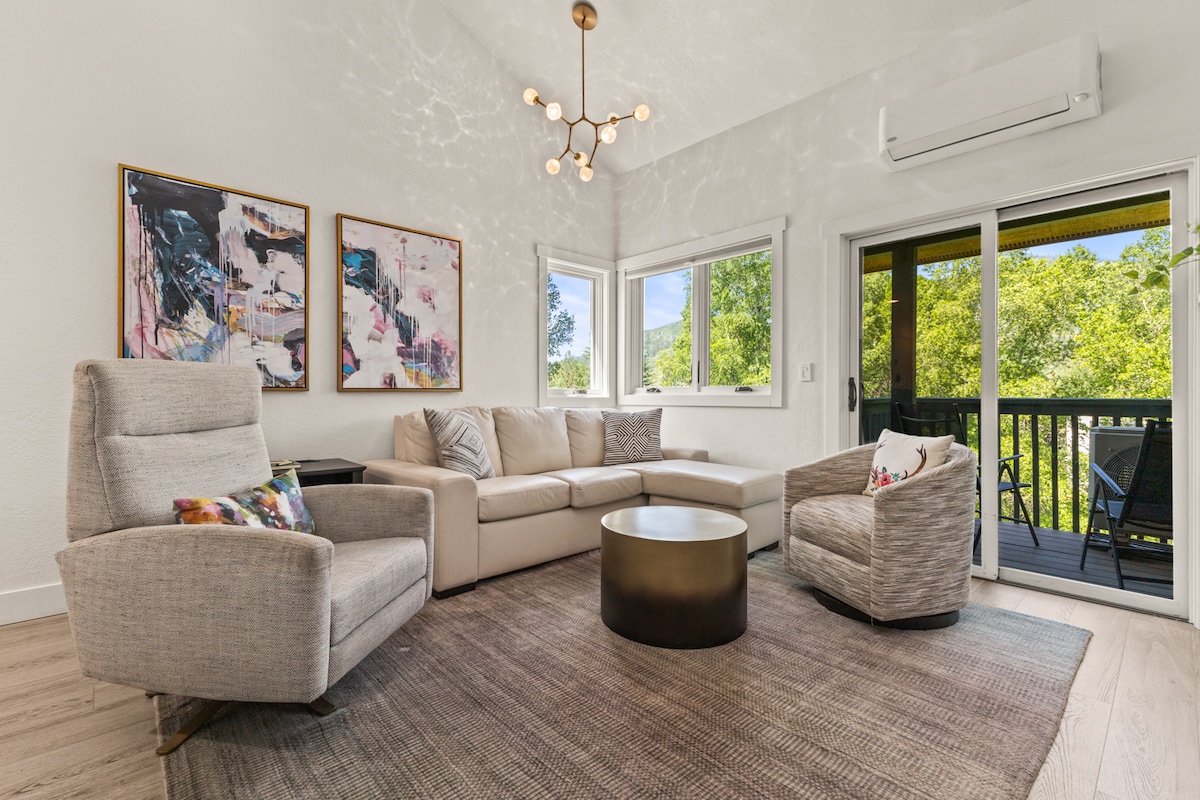 This beautifully renovated apartment is located in a quiet neighborhood minutes from both the resort and town. Enjoy fantastic views of the ski slopes, easy access to the trail system that leads right to town, and the peace and quiet that comes with being nestled in an aspen grove. Cozy up by the gas stove after a day of fun in the snow or in warmer months, relax on the balcony after a day of hiking and biking. Come for a visit soon and see what makes Steamboat so special!