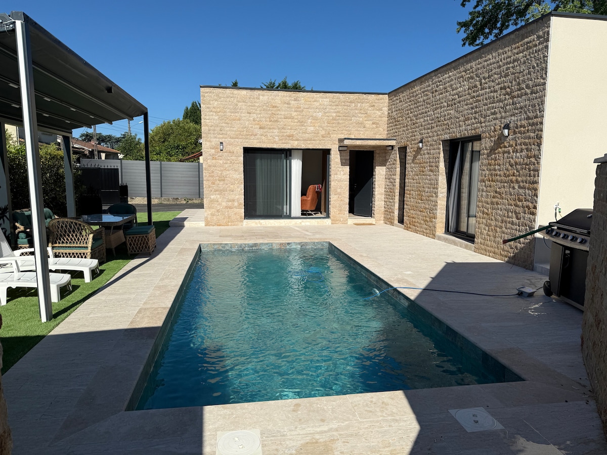 Jolie maison de plein pied « climatisée » de 74m² dans un environnement verdoyant , avec terrasse, petit jardin arboré et parking privé. Proche du Château Lafitte , de Bordeaux, stades, foire exposition , vignobles , etc... Les réservations sont de 2 nuits minimum .