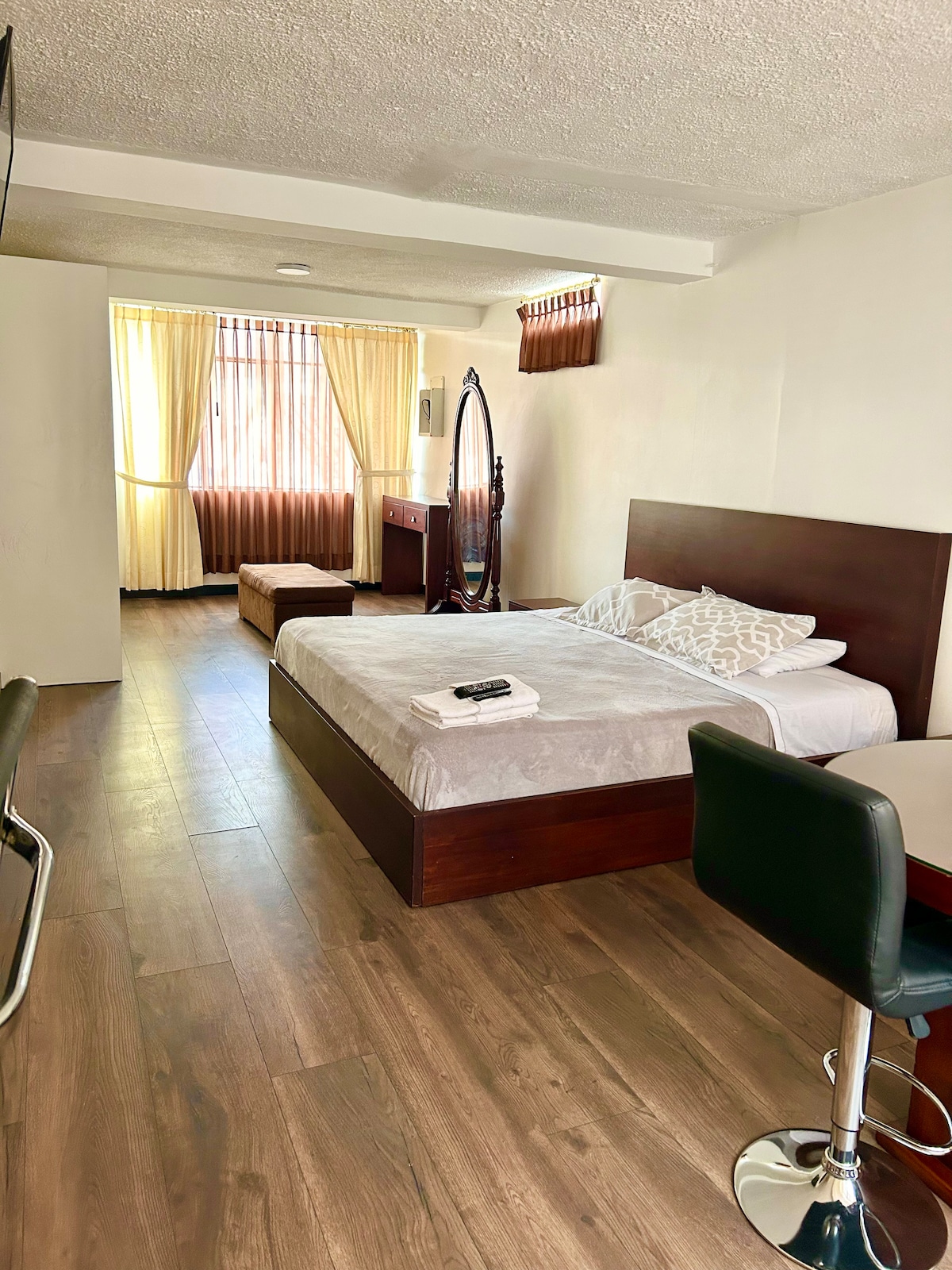 Relájate en este espacio tan tranquilo y elegante. Nos encontramos a pocos minutos del centro de la ciudad acceso a centros comerciales, restaurantes , micro mercados , cafeterías , parques , gimnasios , etc . Nuestra habitación permite disfrutar de su estancia cómoda y placentera ya se encuentra equipada con una cama 🛏️ king , agua caliente, baño completo con sus accesorios, cocina completa para su comodidad y que nuestros huéspedes se sientan como en casa . servicio de wifi 🛜 y garage.