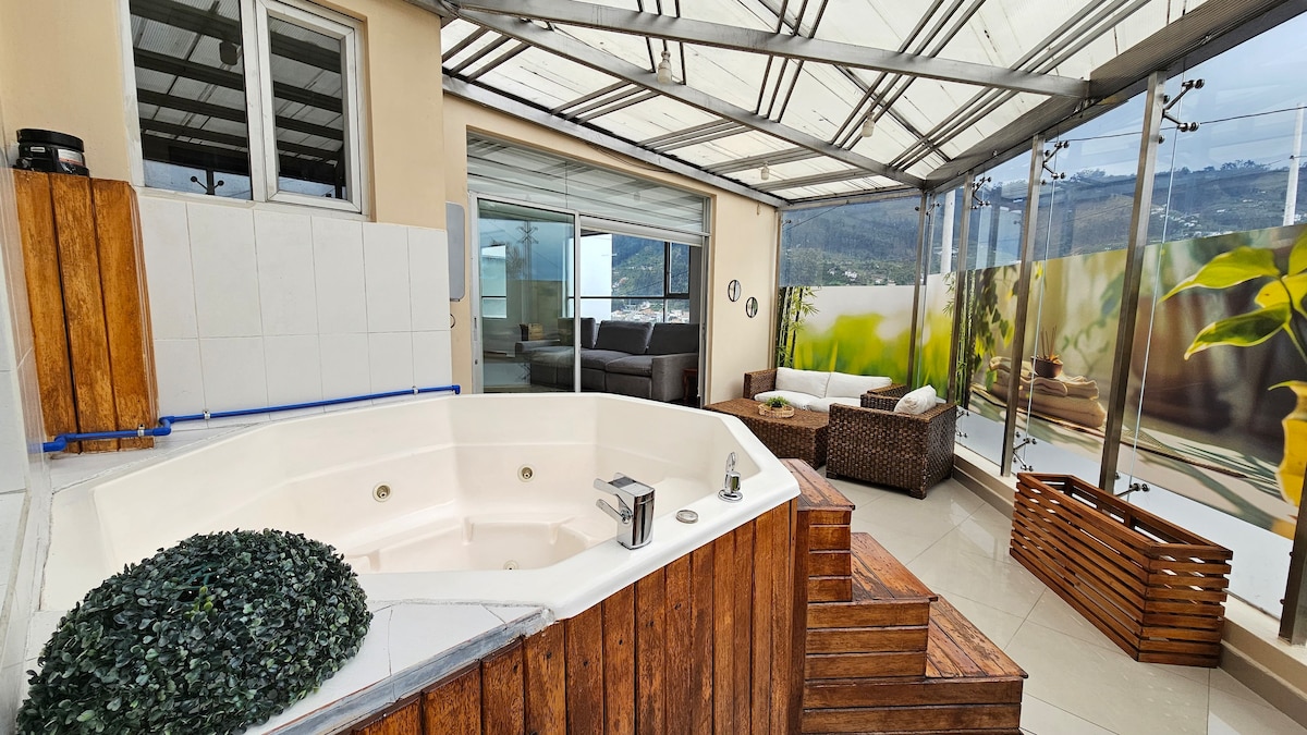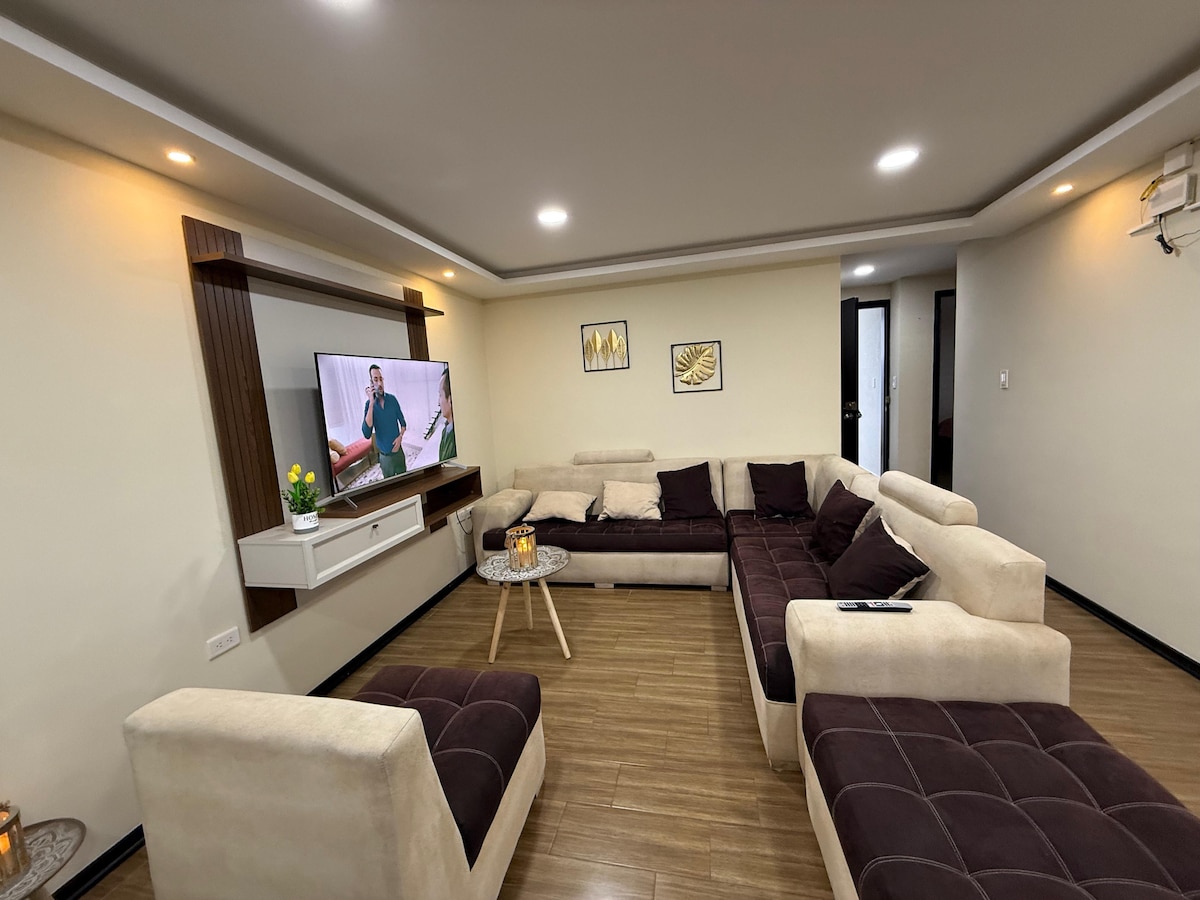 Es un hermoso departamento de dos dormitorios, estilo urbano moderno, con entrada independiente, y mucha tranquilidad, consta de sala, comedor y una cocina completa con todos los implementos, además te dejamos café y té para que te prepares como si estuvieras en casa. Te dejamos toallas, chocolate y agua en tu hospedaje. Se encuentra en planta baja, es de fácil acceso. Tiene 3 Tv plasma con Netflix, Amazon Prime y HBO, además cuenta con internet de alta velocidad. Incluye Garage gratuito.