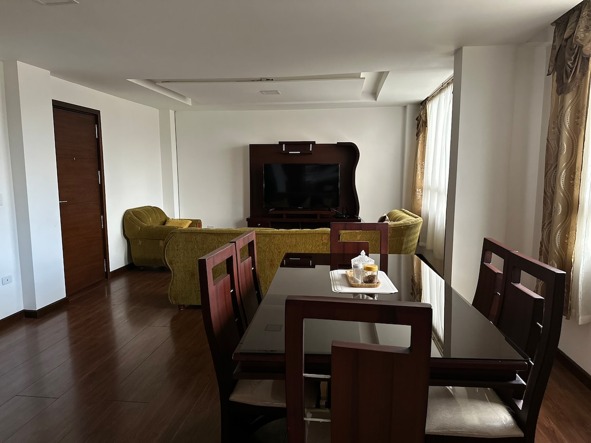 Si necesitas hospedaje esta es la mejor opcion para ti. Un lujoso departamento amoblado de 2 habitaciones con baño compartido y cuarto master. Para tu comodidad dispone de cocina, parqueado privado y agua caliente. Incluye internet de alta velocidad y cuenta con televisores en cada habitación.