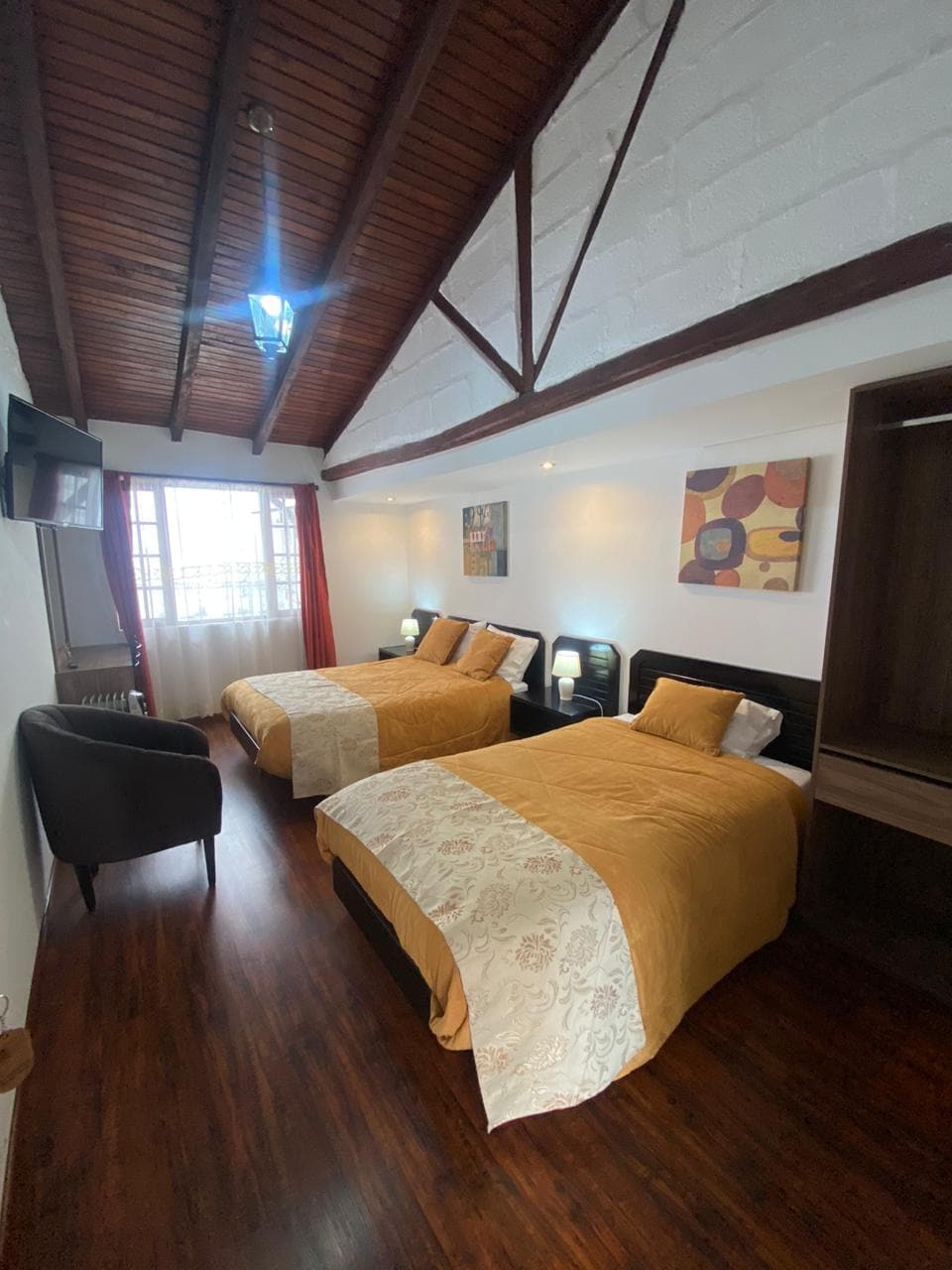 Quinta - Hotel Las Buganvillas, ofrece alojamiento ideal para familias, tranquilo con amplios espacios verdes para la comodidad de los huéspedes en Ambato. Cada habitación cuenta con TV de pantalla plana, calefactor, armario, dispensador de agua, estación de café, áreas verdes así como un baño privado. A 10 minutos del Jardín Botánico Atocha-La Liria. La propiedad está a 10 minutos a pie del centro de la ciudad.