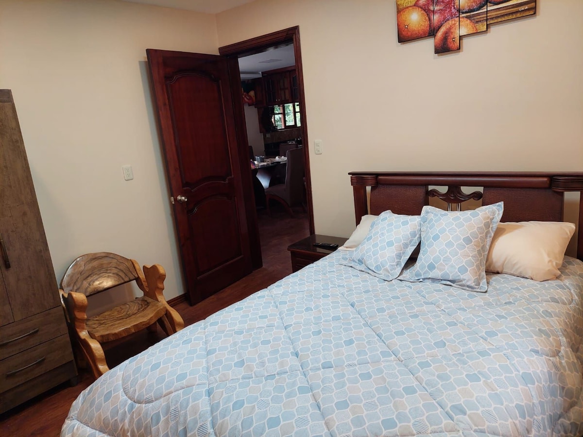 Casa con garage independiente. Localizada a 3 mins del nuevo terminal de buses del sur, a 7 minutos del Mall de los Andes en auto a 5 mins en auto de la Universidad Técnica de Ambato. Tiene 3 habitaciones, 1 habitación máster(cama de 2 plazas 1/2) con baño independiente,2 habitaciones stándars. Sala acogedora con wifi, chimenea eléctrica y plasma de 60 in. Cocina equipada con horno, refrigerador y accesorios de cocina. Área al aire libre para el descanso.