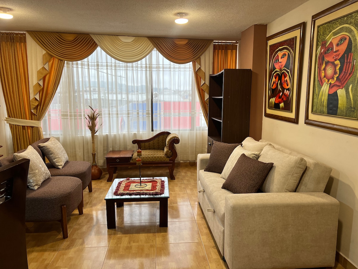 Disfruta de una estadía cómoda en este moderno departamento amoblado en el centro de Ambato. Ideal para familias o parejas, cuenta con 2 dormitorios con TV, sala con sofá cama (hasta 6 huéspedes), cocina equipada, con refrigerador, microondas, licuadora y utensilios de cocina, comedor para 6, baño completo y decoración acogedora. Edificio con cámaras de seguridad, ubicación estratégica y ambiente familiar cerca de todo. Ideal para: Estancias cortas o largas en el corazón de Ambato. -No garaje