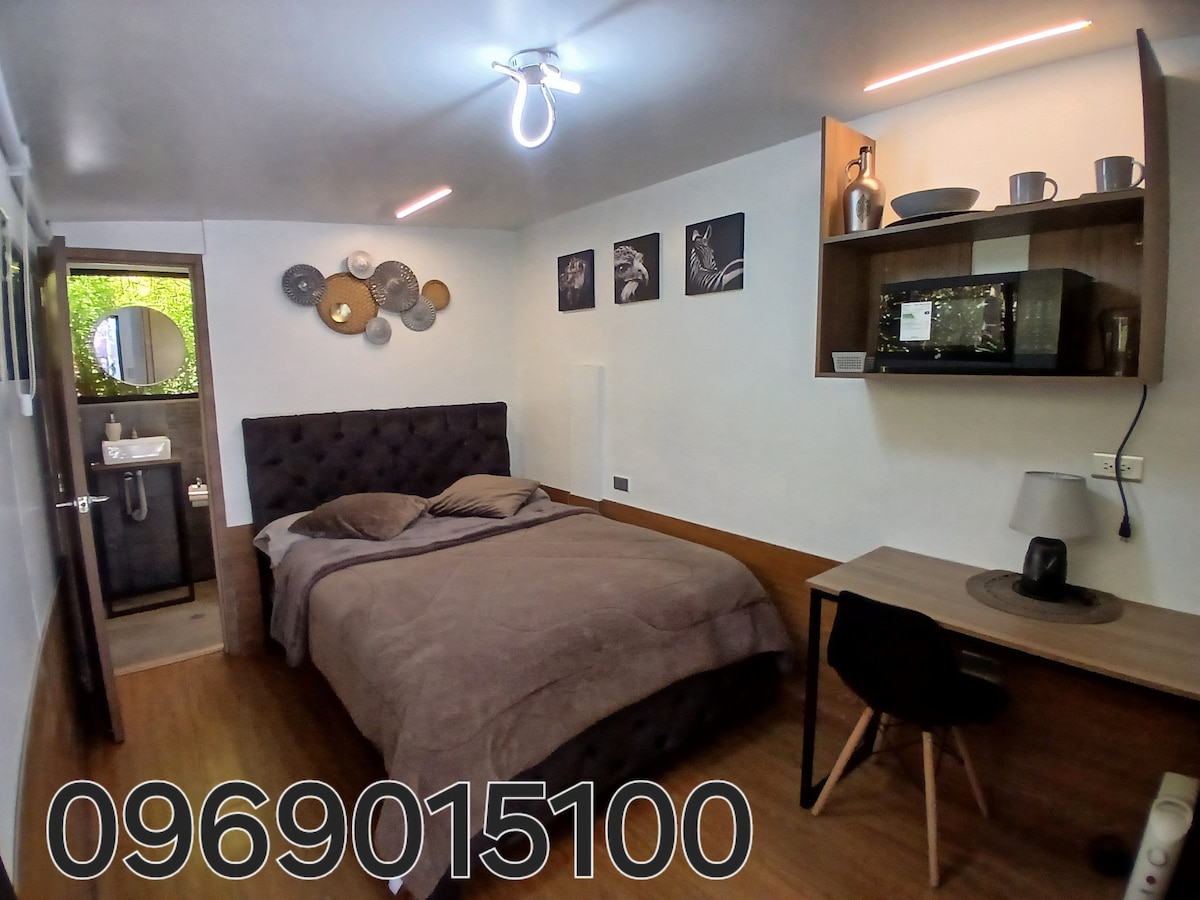 Disfruta de este alojamiento tranquilo, en donde podrás llegar a ver quindes/colibríes desde la ventana. Además cuentas con una muy buena ubicación, muy cerca al centro de la ciudad, centros comerciales, y lugares turísticos como la Quinta de Montalvo