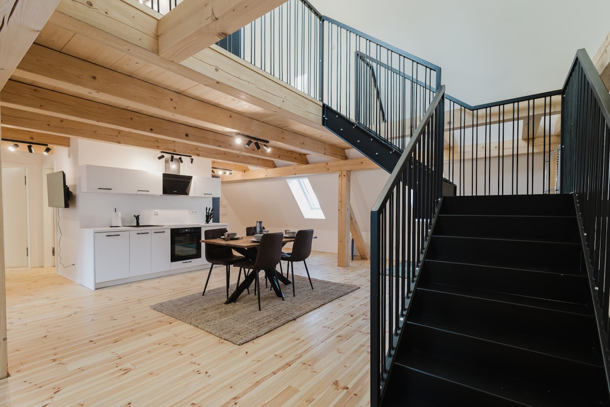 The guesthouse of the villa Alfeld, completed in 2024, is idyllically situated in the middle of the beautiful village of Alfeld in the Nuremberg region. The location of the accommodation, away from the main road with its south-facing orientation, offers you peace and relaxation at all times. Enjoy the sensational view through the all-glass front into nature and at the villa built in 1896. Relax in our lounge corner on the gallery and take a break from everyday life.