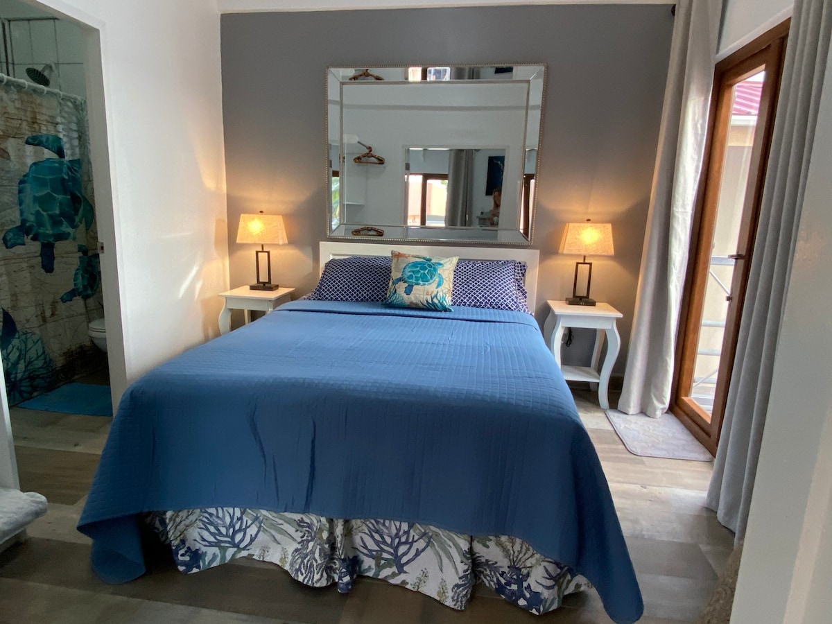 Third floor Miramar Villa #9 has a breathtaking view of the sea–you will love gazing at the waves crashing over the Barrier Reef just ½ mile (1 km) away from the spacious covered veranda! The principal bedroom has a king bed & en suite bath; the second bedroom has two twins (which can be converted to a king). There is a second full bath off the hall. If needed, there is an air mattress which can accommodate 1-2 additional guests.