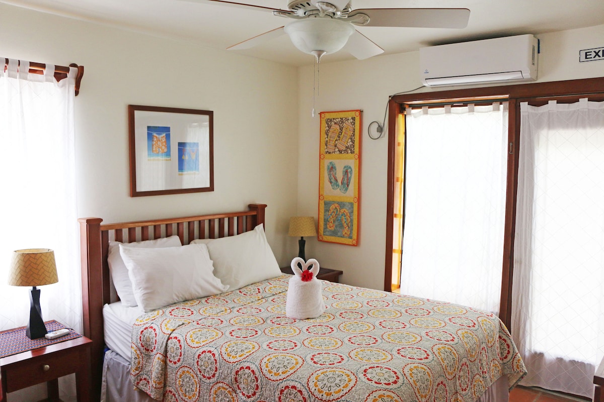 Located in the highly desirable Paradise Villas. This upstairs villa is just on the edge of town but in a quiet gated spot. Two bedrooms and a full sized futon in the living area provides enough room for 4 people. A wonderful queen bedroom with a palm swaying outside of the large windows. The other bedroom can be configured as a King bedroom or two twins. The pool is just steps away and the ocean is just out front. The complex has its own dock that has a wonderful swimming spot right at the end.