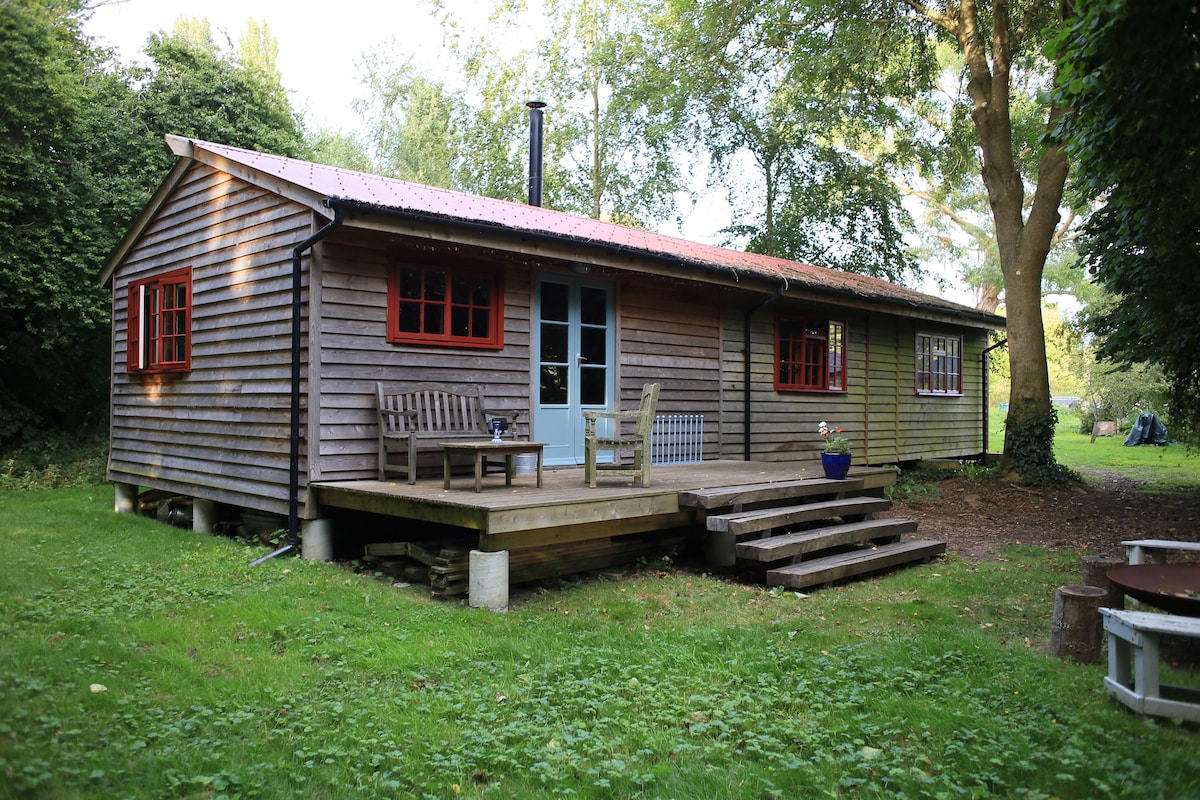 Nestled in the village of Amberley at the foot of the Downs. The hand-built, eco-friendly wood cabin is in the shaded, far corner of the 1 acre plot, facing south towards downland, across fields and a small pond where water birds gather. The cabin is full of rustic charm. It is a completely secluded and tranquil place, ideal for nature lovers and those seeking a short-term escape from the hassle and bustle of city life. It provides a perfect retreat for writers or artists.