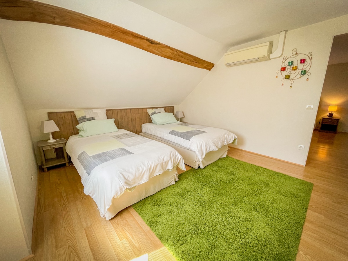 Le logement, à l’étage d’une maison, comprend deux chambres de 15 m² (lits doubles) avec une salle de bain et des WC privatifs. A disposition au même niveau, une mezzanine équipée : kitchenette, canapé non convertible, table, 2 frigidaires, micro-ondes, mini four classique, deux cafetières (une à filtres, l'autre à capsules Nespresso, Dolce Gusto ou Senséo), bouilloire.