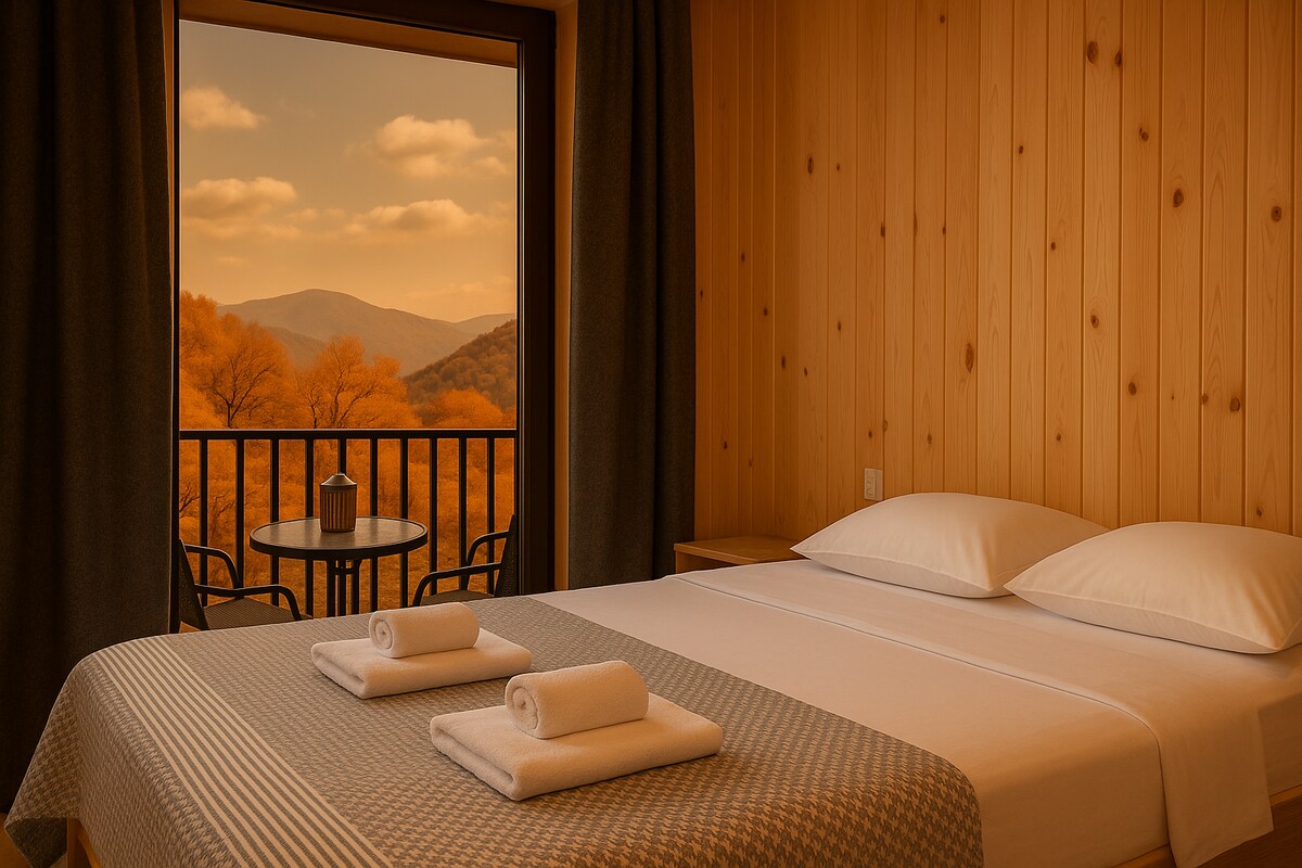 Welcome to our peaceful mountain cottage. Cozy retreat surrounded by forests and mountains. Inside, the cottage is designed for comfort. It features a fully equipped kitchen, a modern bathroom, a bedroom with a queen-size bed, and a living room with a comfortable sofa and a dining table for three. Step outside to enjoy a large garden with a BBQ area and outdoor fireplace, ideal for gatherings under the stars or quiet mornings with coffee or a glass of Georgian wine from the Racha.