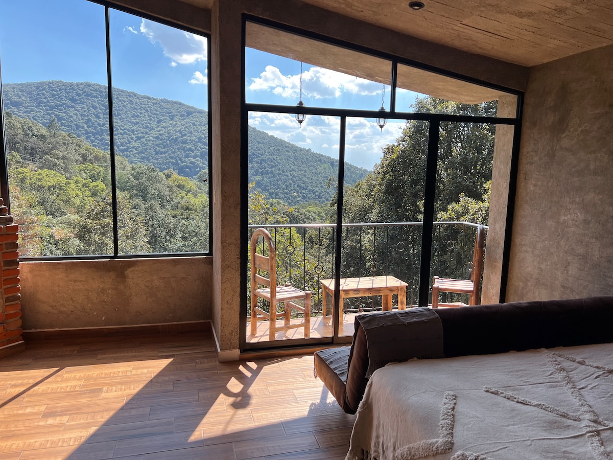 Acogedora cabaña para dos personas con la vista más espectacular de la zona. La cabaña cuenta con cocina equipada, comedor, recamara con cama matrimonial y un baño completo, además de una terraza desde donde podrás disfrutar de los atardeceres más bellos. También tenemos televisión y wifi.