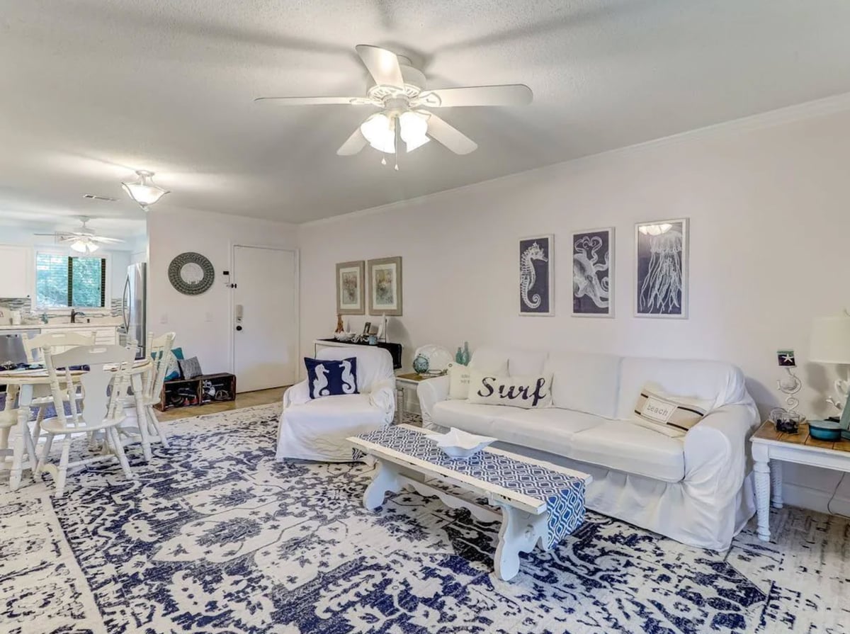 Beachy vibes, 1 block from the Beach. Relax and unwind in this comfy beautifully designed space. Newly renovated kitchen & well stocked (pots, pans, coffee maker, toaster, etc.) ready for use. Condo includes everything you need for a day of fun at the beach (beach chairs, umbrella's, boogie boards, beach towels and beach toys) or just enjoy the amenities(in ground pool, tennis and pickleball courts, playground, and BBQ area). Includes tennis racquets & more. Tropical wooded view, pet friendly