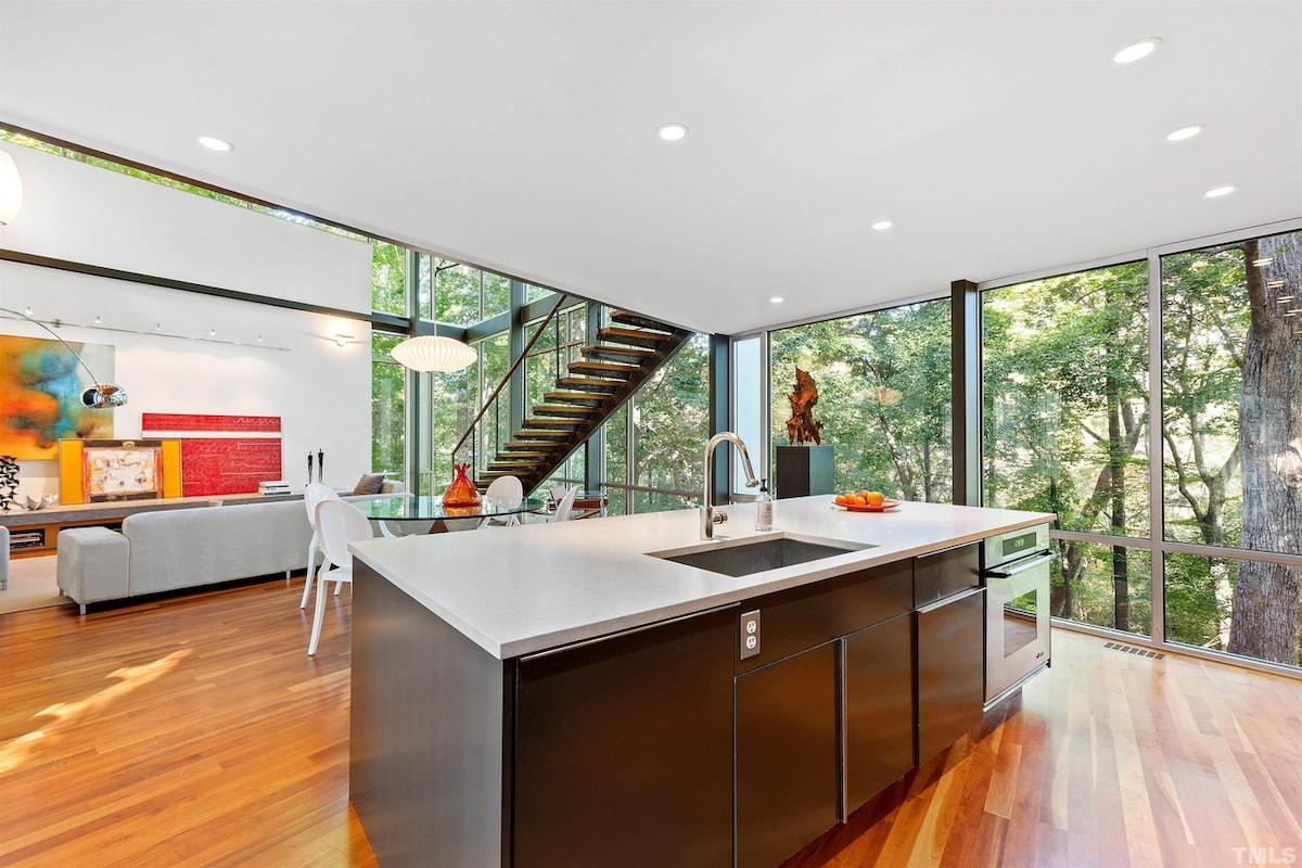 Stunning, private, and truly one-of-a-kind—this unique home is perfect for a vacation, staycation, special occasion, or simply celebrating everyday life. Designed by renowned modernist architect Frank Harmon. The 2,128-square-foot residence sits on 1.3 acres and was crafted with meticulous attention to detail. Inside, you’ll feel nestled among the treetops while remaining conveniently close to restaurants, shopping, downtown Raleigh, WakeMed, UNC, Duke, and Research Triangle Park.