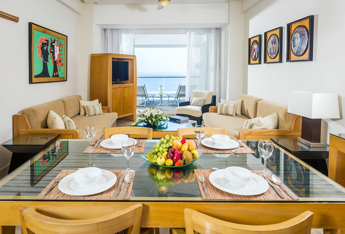 The One Bedroom Suite features one bedroom with a king-size bed, one bathroom, and a living room with a dining table and kitchen. This space also features a balcony and two TVs. Occupancy: 4 Adults and 2 Children under 12