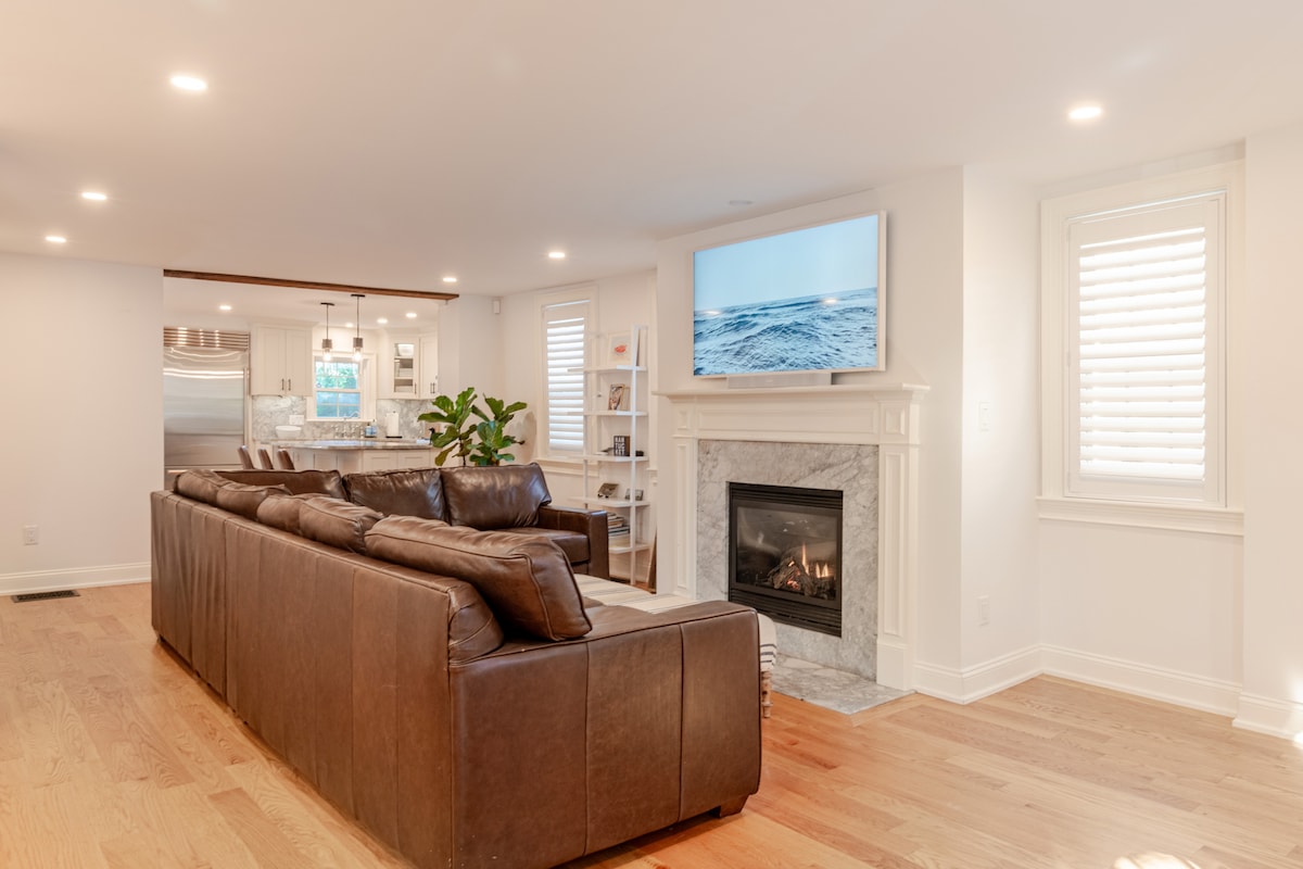 Your family will be close to everything when you stay at this centrally-located Antique New England getaway . Recently renovated, but tastefully original. Everything you need is within walking distance; shopping, grocery, dining, lake, short drive/ride to beach. The space is about 900sqft; 1 bathroom, king bedroom, queen bedroom, queen pull-out couch, and an additional room in which a twin bed can be put (upon request). It will comfortably hold 4 adults, but will accommodate up to 7.