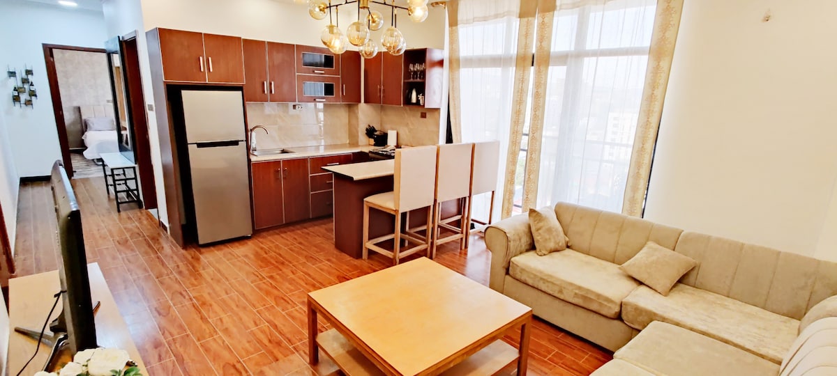 Hayahulet, fully furnished three bedrooms apartment for rent, Addis Ababa. The apartment is located on safe residential building, and it is on the second floor. It has living and dinning room with two balconies, kitchen with laundry corner, master be