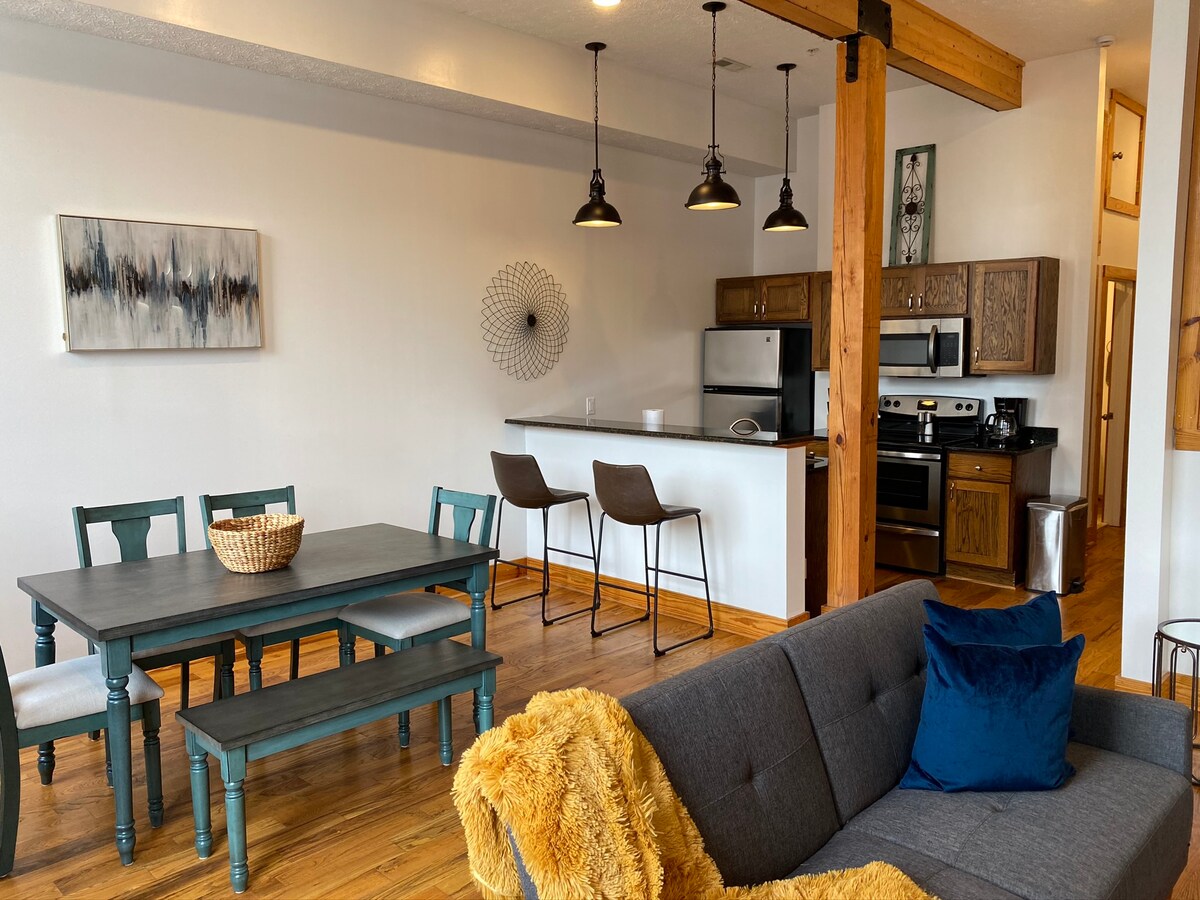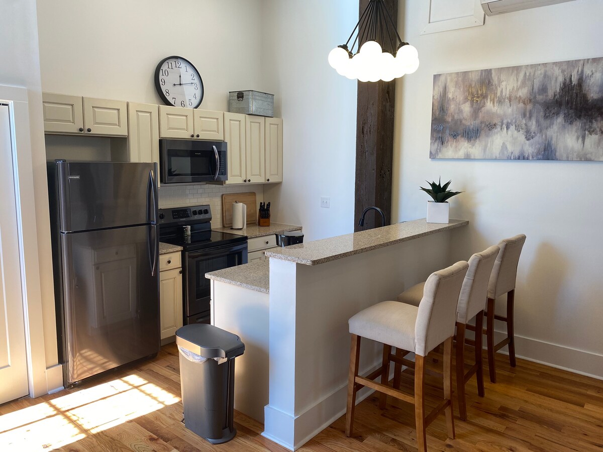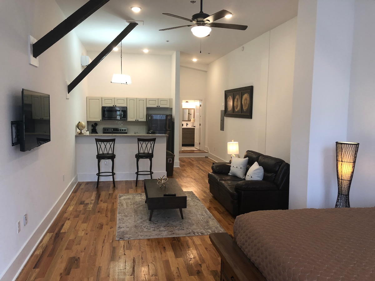 Main Office Lofts are located in a renovated commercial building in the heart of Downtown Lynchburg Virginia. The Panel downtown Loft has character & modern amenities in 850sf of space. Very comfortable queen bed, full bathroom, kitchen with microwave, fridge, stove and dishwasher, comfortable queen sleeper couch, and more The bedroom is separated from the living room by the panel wall This unit comfortably sleeps 2-4 people Accessible by one flight of stairs No smoking in Loft or Building