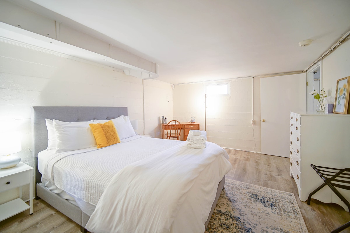 Welcome to your Suburban Suite, your cozy getaway nestled in a serene neighborhood. This charming basement apartment is your perfect escape to relax & unwind. Inside, you'll be greeted by a spacious bedroom, a welcoming living area, & a fully equipped kitchen, everything you need for a comfortable stay! Step outside and relax on the large screened-in patio & firepit. Send us a message or book your stay and experience the comfort and convenience of your new favorite getaway.