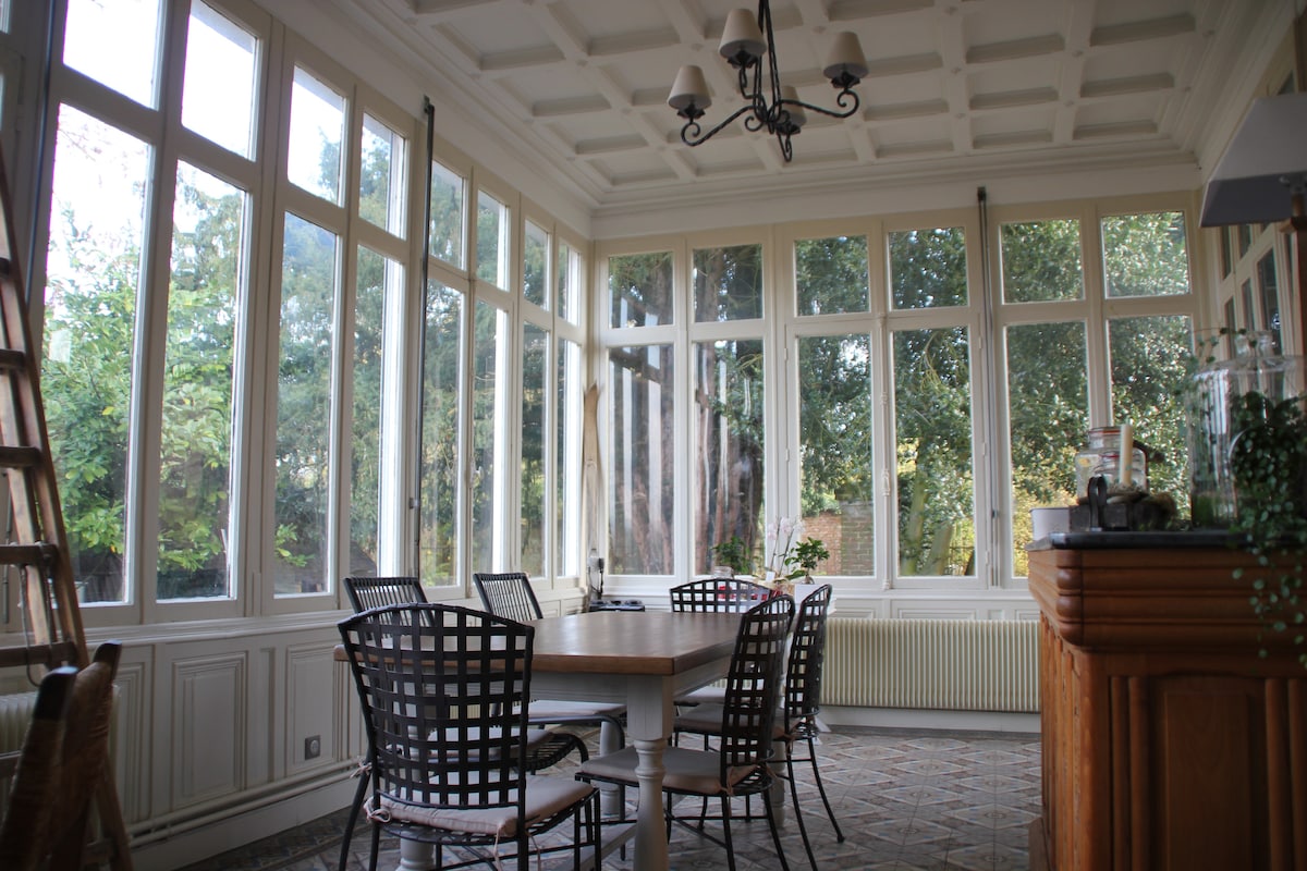 Chambre 35m² tout confort au 1er étage, pour 1 ou 2 personnes + pts déjeuners dans une maison bourgeoise avec un jardin paysagé, meublée d'un lit XXL 160x200 avec commandes électriques, TV écran plat, commode, dressing +lit bébé, plateau d'accueil (cafetière + bouilloire), - petit salon : 1 bureau, 2 chaises, 1 table basse et 2 fauteuils, - coin salle d'eau avec lavabo + sèche-cheveux + douche à l'italienne. Les WC sont indépendants. Salle de sport à disposition. A 45 mn de la baie de Somme.