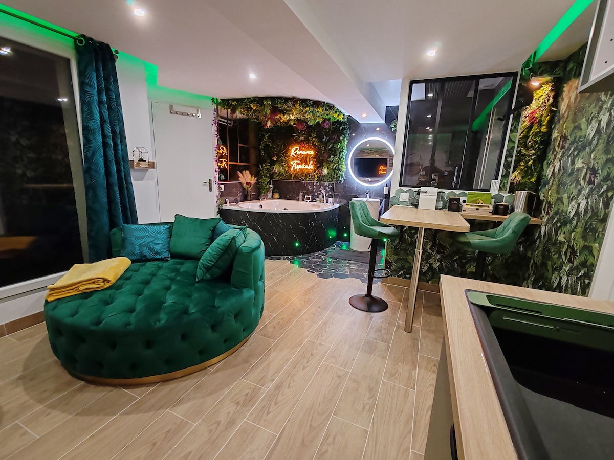 Venez passer un moment de détente à 2 dans notre magnifique Appartement SPA Romantique. La suite Romance Tropicale vous propose des prestations et un style haut de gamme unique ! Vous profiterez à 2 de son magnifique Jacuzzi mais aussi d'une immense douche avec ciel de pluie et jets massant, le tout dans une ambiance tropicale. La chambre vous propose un grand lit Queen size sous un magnifique ciel étoilé pour passer un moment romantique, voir érotique avec son très grand miroir face au lit...
