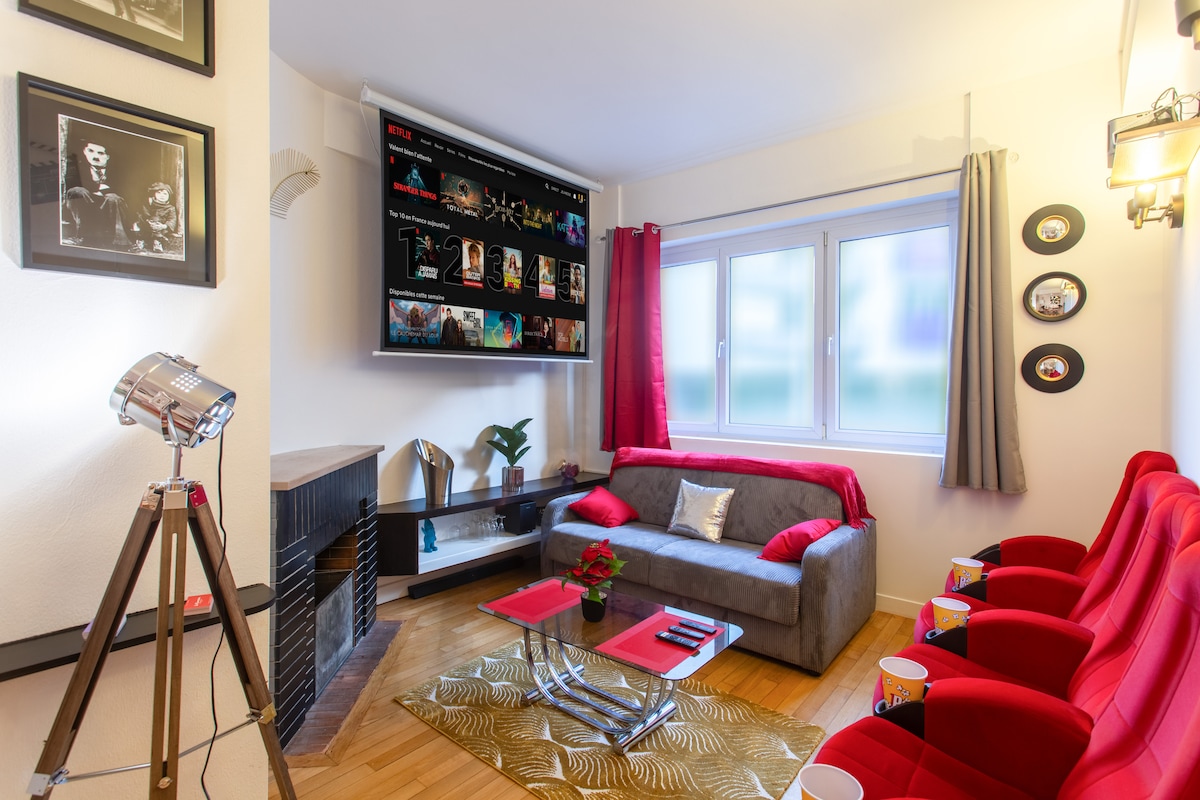 Bienvenue à l'Appart'ciné,🎥 au centre d'Amiens.! Cet espace familial situé à coté du beffroi, peut accueillir jusqu'à 6 amis. Profitez d'une cuisine entièrement équipée, de 2 salles de bain avec baignoire SPA ou douche et d''un spacieux salon avec Home Cinéma privatif. Parking sécurisé à 10 m. Idéalement situé près du festival du film, des commerces et de la rue piétonne, cet Appart'ciné est parfait pour un séjour inoubliable en famille ou entre amis! qu'attendez vous pour le réserver?