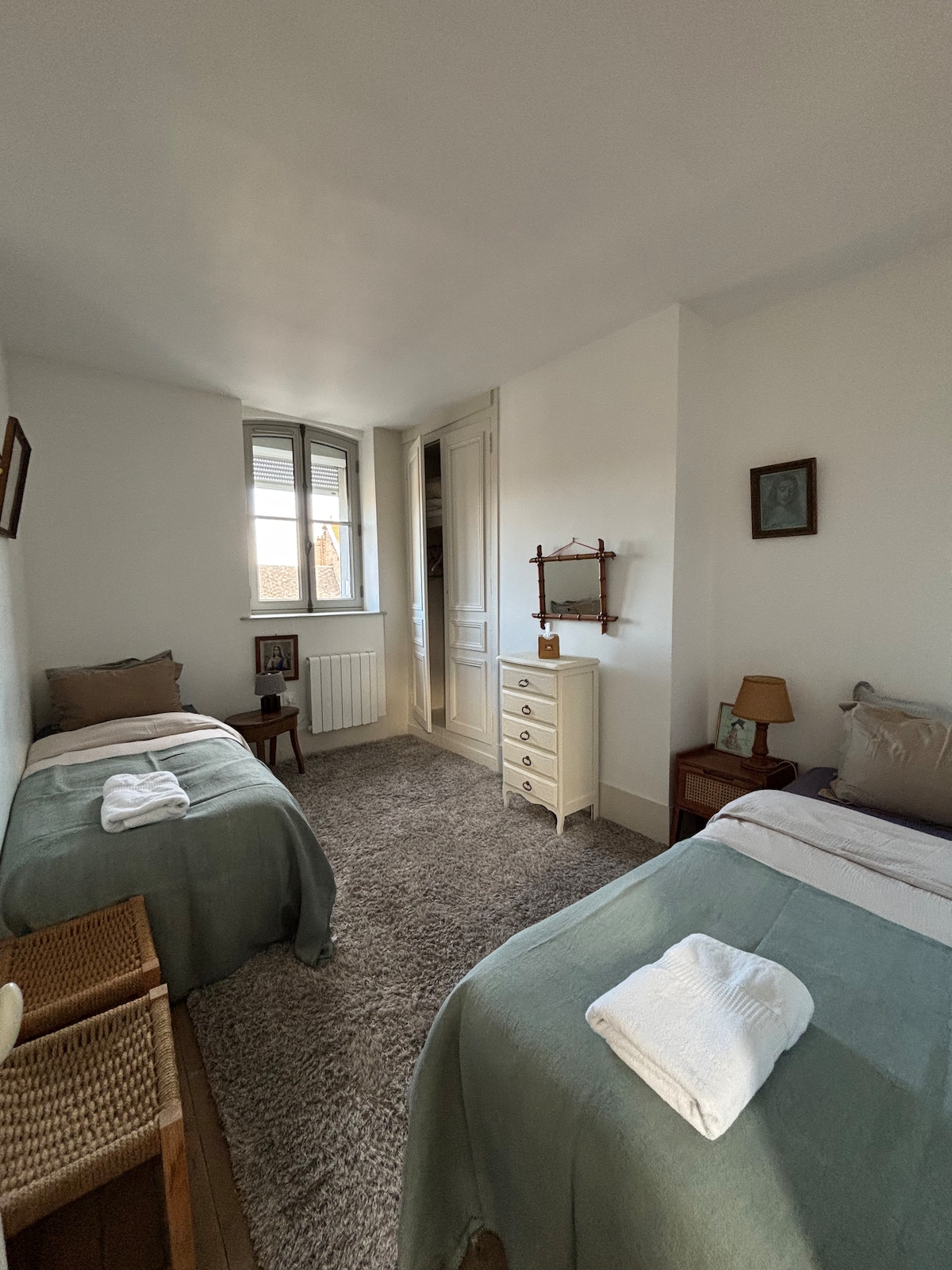 Maison atypique, dans un quartier très calme d'Amiens. Spacieuse, lumineuse, bien équipée, dans une rue au stationnement gratuit, à 20 mn à pied de la gare et du centre. Cuisine avec lave-vaisselle au rdc. Aux 2 étages (escaliers): 3 belles chambres + 1 petite chambre traversante, avec 3 lits de 160 et 1 lit de 90. 2 salles d'eau et 2 wc (dont 1 sanibroyeur). IMPORTANT : IL N'Y A PAS DE SALON, NI D'EXTERIEUR. Lit et chaise bb. Idéale pour un court séjour à Amiens. Stockage de vélo impossible.
