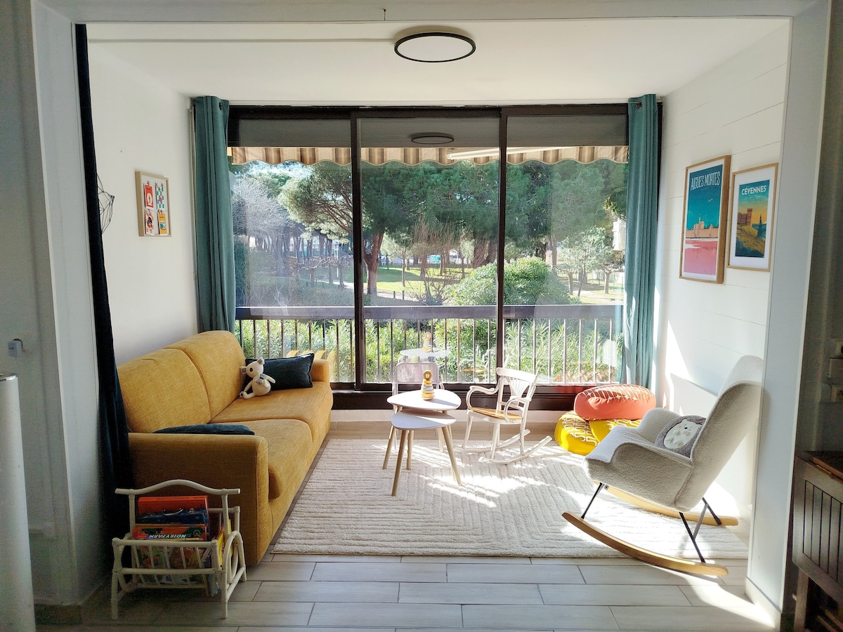 Venez découvrir le charme de port camargue dans ce logement au bord de mer. Lumineux et confortable de 32m2. Wifi (fibre) Appartement dans résidence avec piscine qui sera ouverte du 15 juin au 15 septembre de 9h a 20h Stationnement dans la résidence Jeu de boules, parc enfants à proximité Local à vélos Draps et serviettes de toilettes fournis. Animaux de compagnie acceptés. Posez vos valises dans ce joli cocon!