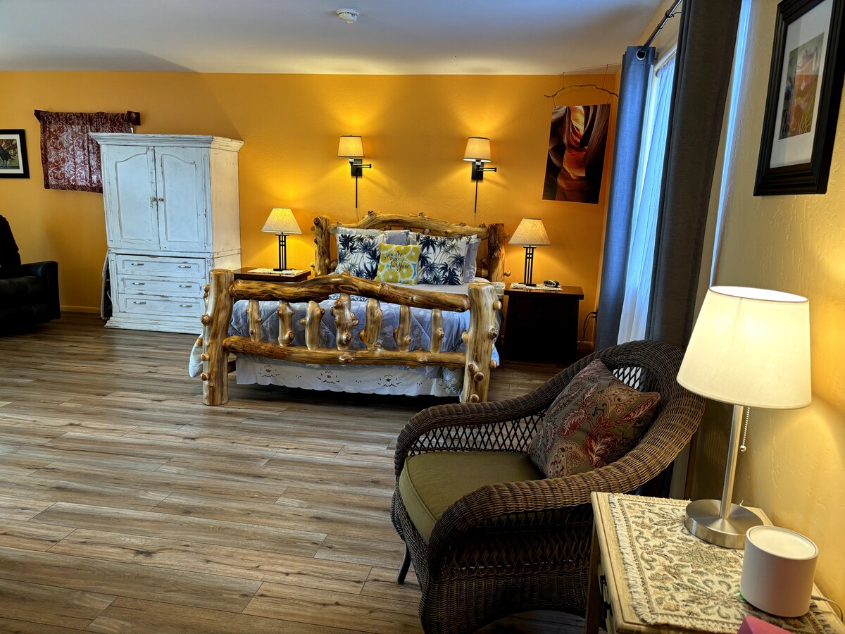 Love is all around at Cosmic Bloom Cottage ❤️ your Luxe Sedona getaway. This newly remodeled King Bedroom Suite for two features large windows with amazing views, premium bed, designer sofa, elegant bathroom and fully equipped kitchenette with cozy outdoor seating. A hidden gem, enjoy feeling worlds away while centrally located and at the base of several trailheads. Unwind in nature, treat yourself to an abundance of excellent eateries, or try out a unique and transformative healing experience.