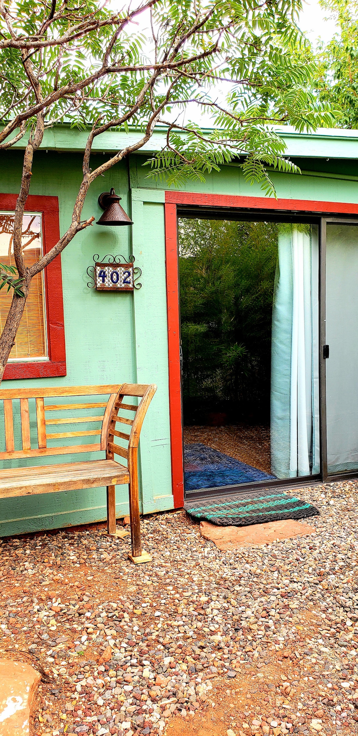 GLOWING MOUNTAIN VIEWS! West Sedona private casita at the base of Thunder Mtn. Walk to Andante trail system for hiking & biking or Amitabha Stupa for meditation. Cozy, tranquil , and convenient, our 4 room, 450 sq ft casita has private patio, kitchen, washer/dryer, central air, & off street parking. Close to restaurants & grocery store. Quiet neighborhood. Equipped for 4 guests. Dogs & cats welcome! Perfect for families w/infants, single travelers, & couples. Work friendly w/fast wi-fi.