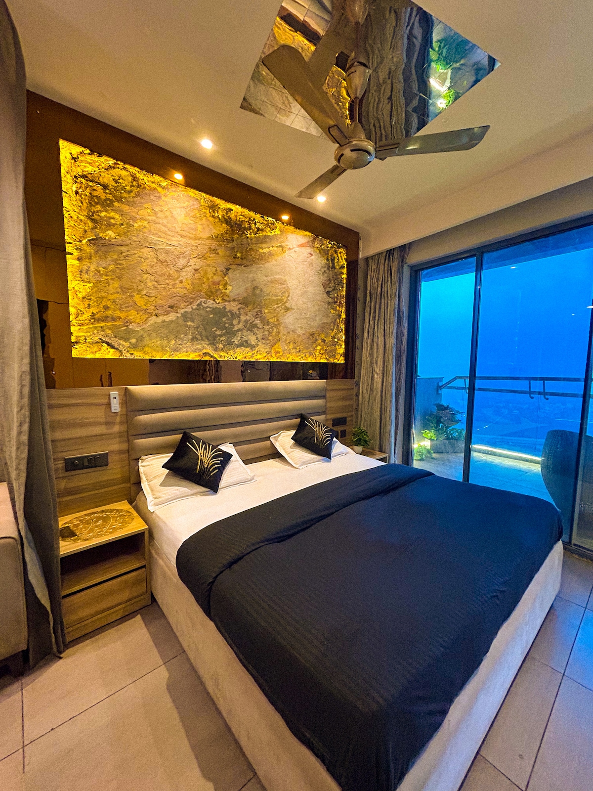 🏙 City Views -Enjoy sparkling night lights, metro line views, and a peaceful skyline. 🛋 Cozy Living Area- Beige sofa, marble-top table, for an aesthetic feel and 🛏 Hotel-Style Bedroom - Premium cushioned bed and ideal for date nights. 📺 Work & Chill Zone- Dedicated desk, comfy rotating chair, and a mounted TV for smooth work + entertainment. 🍳 Modular Kitchen- Microwave, fridge, sink, cabinets, and basic cutlery , perfect for home-like comfort,Perfect for couples &Solo travels