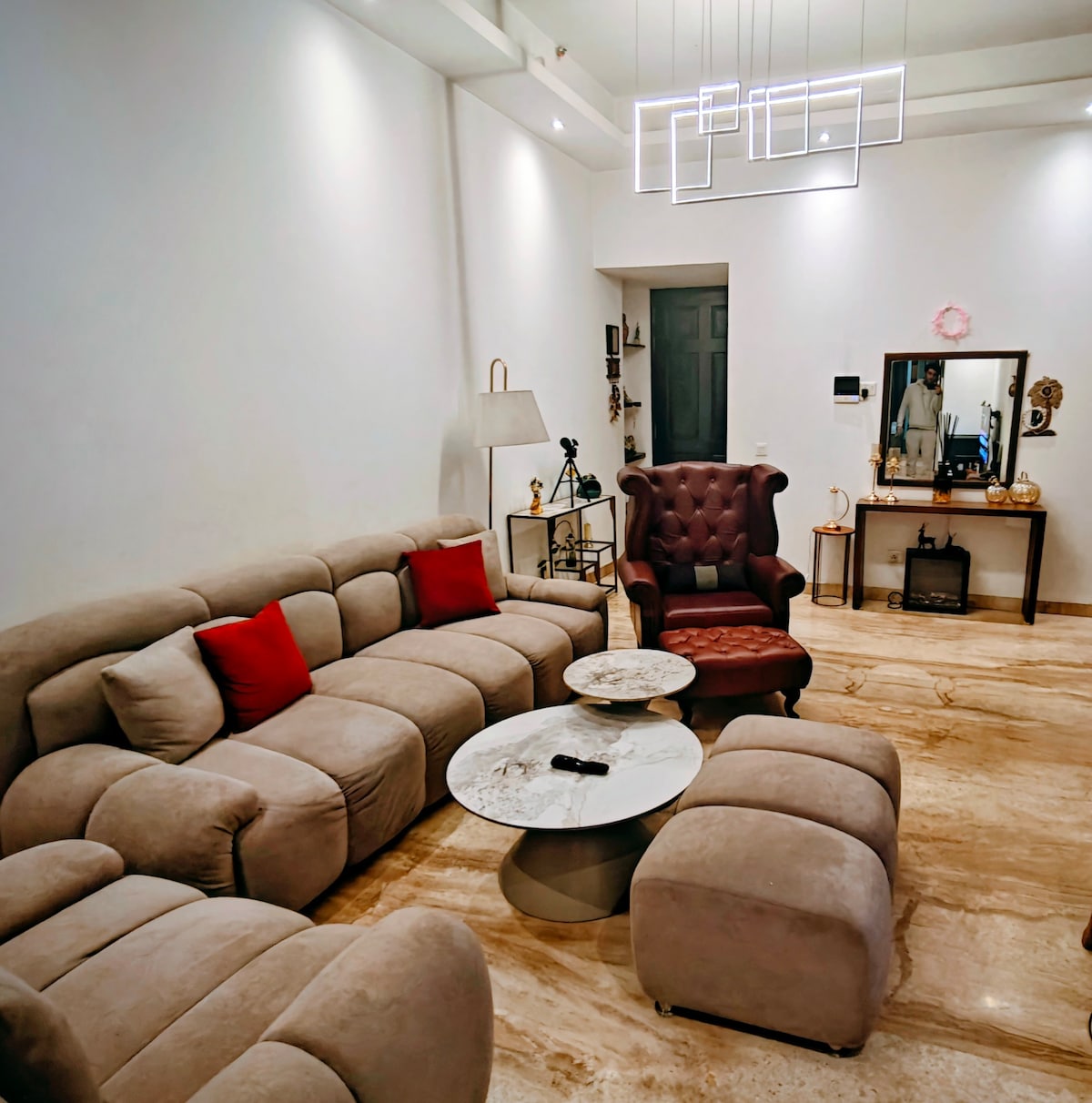 A luxurious space in a quiet, green n posh area w no crowds & a fav w expats. Perfect for a getaway/work trip. Intl Airport -10 mins Few steps from our driveway take u into an expansive lounge w plush seating & pub style bar w a kitchen & powder room. Kitchen Equipped w Hob+micro+oven+electric kettle+Nespresso+Nutribullet. Bedroom has a King bed+42"TV &en-suite washroom. Study/office is perfect for work needs You’ll find a single day bed in the lounge area which is used for the third guest .