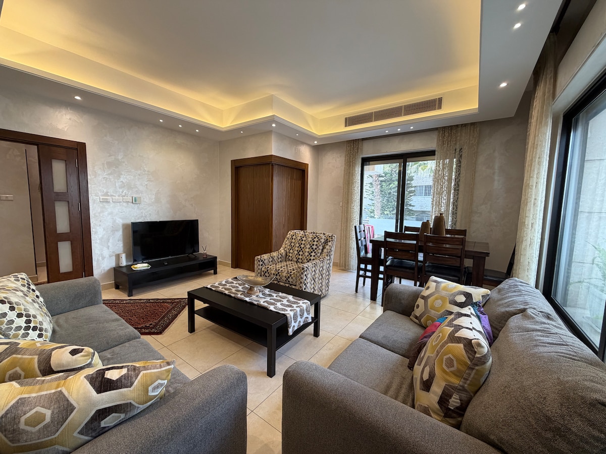 Beautiful apartment 5 minutes away from Taj mall and Saudi embassy. Very peaceful 2 bed, 2 bath around facilities and nice view. Abdoun is the safest and most serviced area in Amman, close to all main attractions. The apartment has most appliances and amenities, it is very luxurious and feels cozy with gorgeous interior, fire-place, and much more! It has 2 supermarkets within walking distance and it is a very safe and peaceful neighborhood, if you have any questions do not hesitate to ask.