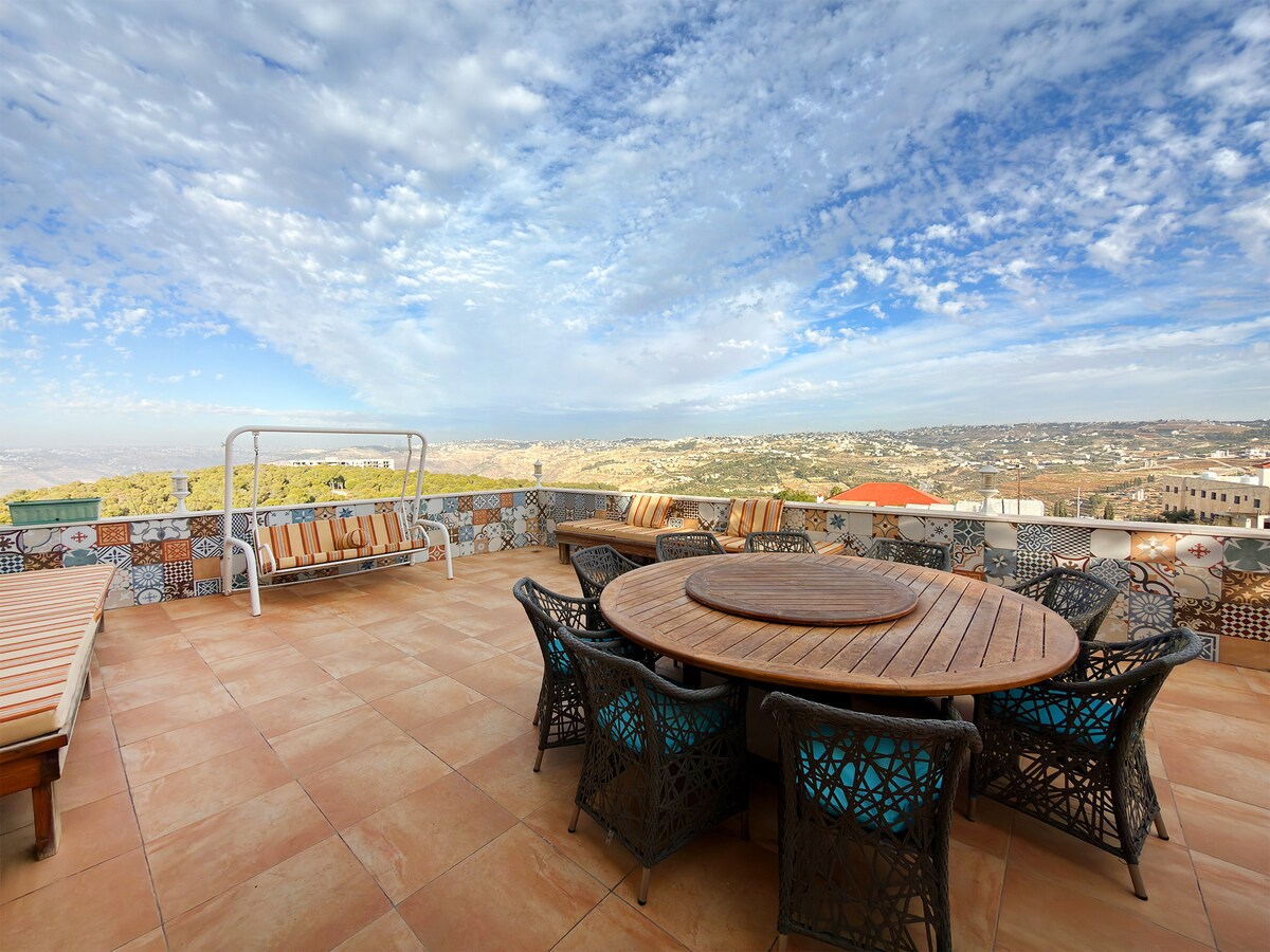 Features include: Two master suites with king-size beds & private bathrooms Additional queen bedroom + twin bedroom Open-plan living & dining with 70” Smart TV and 8-seater dinning table Fully equipped kitchen with dishwasher & breakfast nook Cozy family/games room with fireplace Balcony overlooking Amman Free basement parking Just a 10-minute walk to Al Rabieh shopping district with restaurants, cafés, shops, pharmacies, and supermarkets Queen Alia International Airport is only 25 minutes away