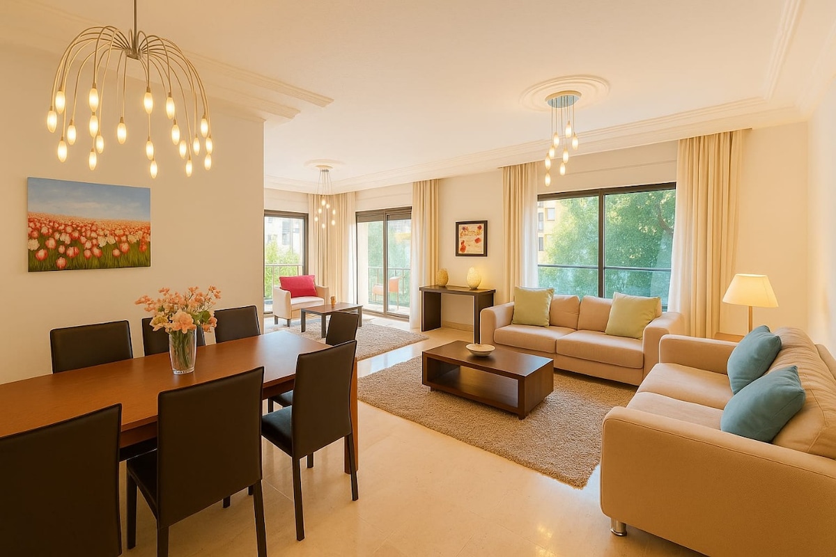 Brand-new spacious condo in upscale Dabouq. Featuring a modern open layout, elegant ceilings, and abundant natural light, it offers a stylish living room with smart TV and comfy seating, opening to a large balcony with sweeping city and hillside views. Three cozy bedrooms, luxury bathrooms, and a guest powder room ensure comfort. Includes Wi-Fi, AC, and parking. Perfect for families or groups seeking a quiet yet central, high-end stay in one of Amman’s most desirable areas.